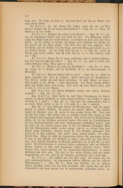 Dr. Adler: Schlafen Sie allein in der Küche? — Exp. Nr. 51: Ja, nur an Sonntagen schläft noch das Kind bei mir. Die Wohnung besteht außer der Küche noch aus einem Cabinet, in welchem ein Herr und eine Frau schläft. In der Küche, in welcher ich schlafe, wird während der Woche für den Herrn und die Frau gekocht. Sie wird aber sehr rein gehalten. Von der Küche geht ein Fenster auf den Gang, und vom Gang geht gleich vis-a-vis ein Fenster hinaus. In der Früh stehe ich um 8, V 4 ? Ühr aus: wenn ich Arbeit nach Hause nehme, lege ich mich erst um 11, 12 Uhr schlafen, sonst um 9 Uhr.