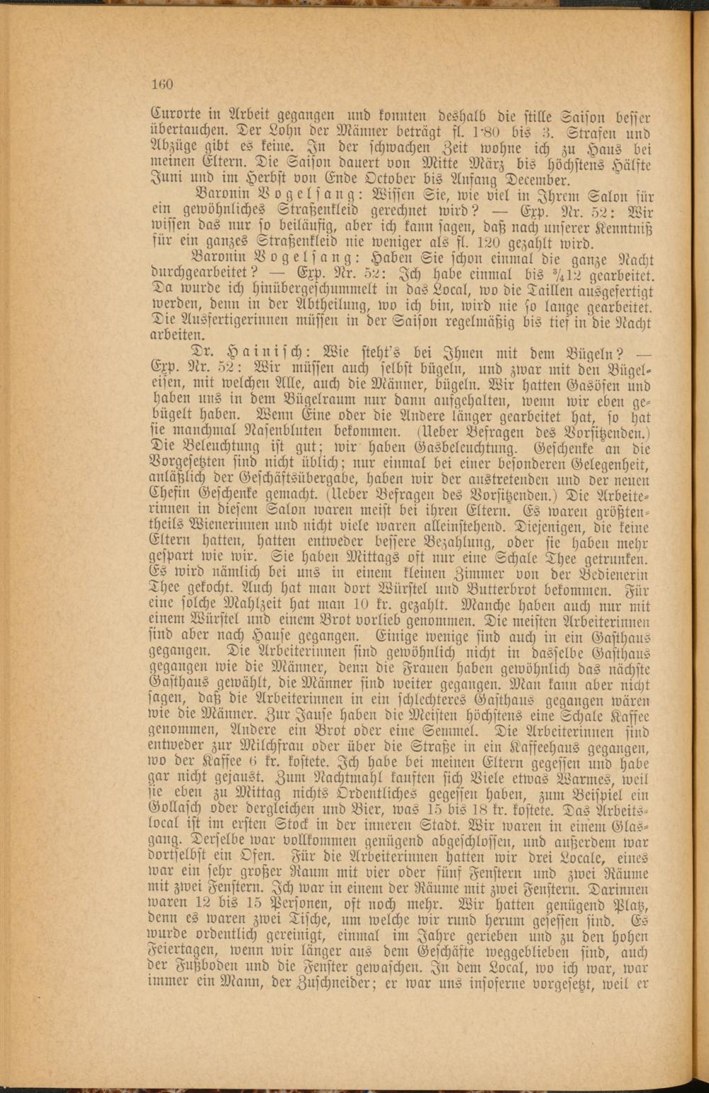 Baronin Vogelfang: Haben Sie schon einmal die ganze Nacht durchgearbeitet? — Exp. Nr. 52: Ich habe einmal bis V 4 I 2 gearbeitet. Da wurde ich Hinübergeschummelt in das Vocal, wo die Taillen ausgefertigt werden, denn in der Abtheilung, wo ich bin, wird nie so lange gearbeitet. Die Aussertigerinnen müssen in der Saison regelmäßig bis tief in die Nacht arbeiten.