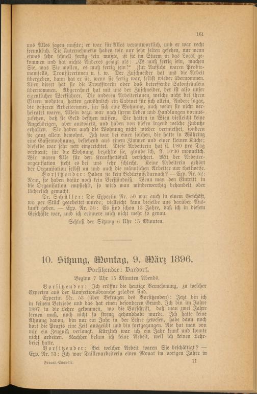 Dr. Schüller: Die Expertin Nr. 50 war auch in einem Geschäft, wo per Stück gearbeitet wurde; vielleicht kann dieselbe uns darüber Auskunft geben. — Exp. Nr. 50: Es sind schon 13 Jahre, daß ich in diesem Geschäfte war, und ich erinnere mich nicht mehr so genau.