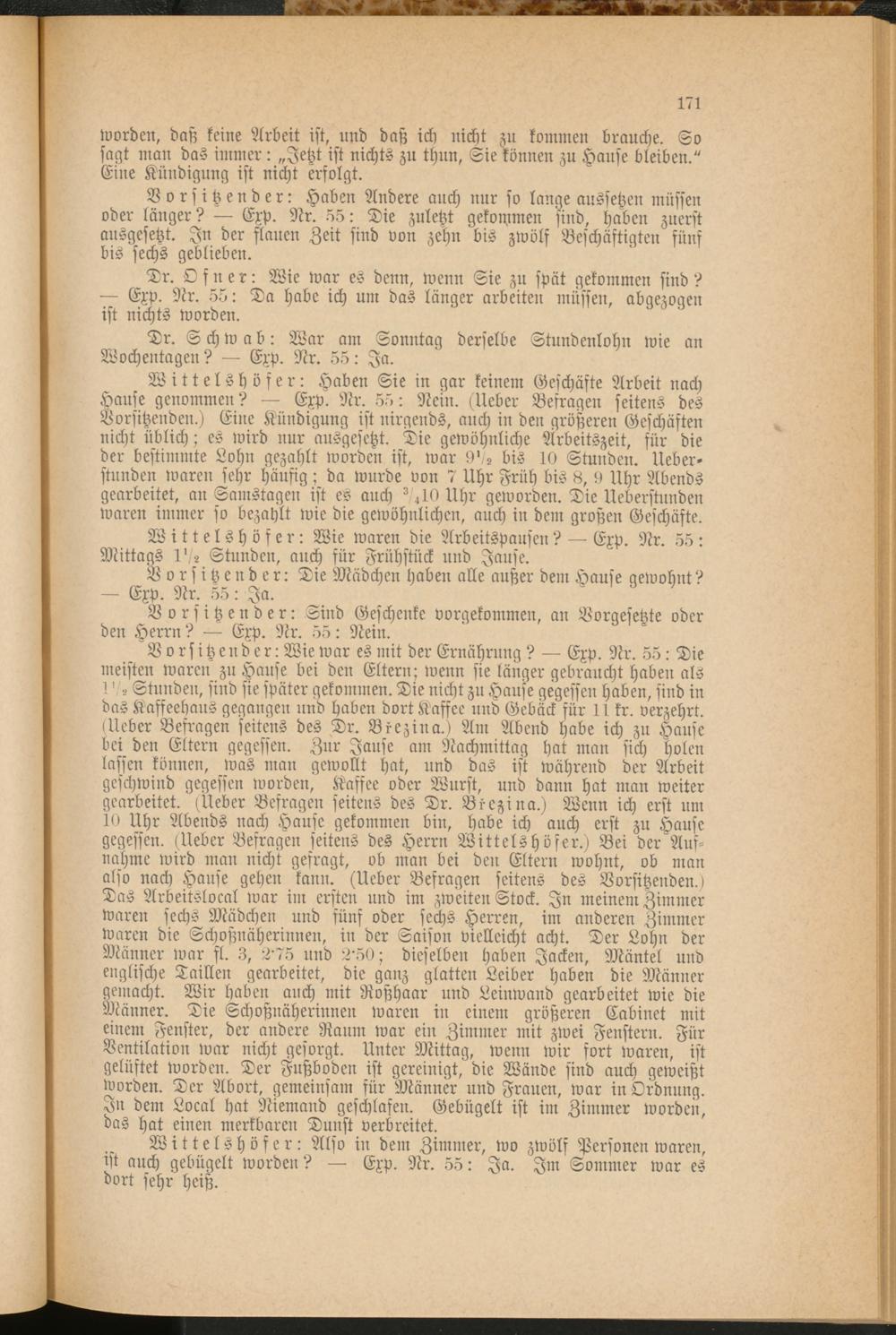 Vorsitzender: Wie war es mit der Ernährung? — Exp. Nr. 55: Die meisten waren zu Hause bei den Eltern; wenn sie länger gebraucht haben als 1' -- Stunden, sind sie später gekommen. Die nicht zu Hause gegessen haben, sind in das Kaffeehaus gegangen und haben dort Kaffee und Gebäck für 11 kr. verzehrt. «Ueber Befragen seitens des Dr. Brezina.) Am Abend habe ich zu Hause bei den Eltern gegessen. Zur Jause am Nachmittag hat man sich holen lassen können, was man gewollt hat, und das ist während der Arbeit geschwind gegessen worden, Kaffee oder Wurst, und dann hat man weiter gearbeitet. (Ueber Befragen seitens des Dr. Brezina.) Wenn ich erst um 10 Uhr Abends nach Hause gekommen bin, habe ich auch erst zu Hause gegessen. (Ueber Befragen seitens des Herrn Wittelshöser.) Bei der Ausnahme wird man nicht gefragt, ob man bei den Eltern wohnt, ob man also nach Hause gehen kann. (Ueber Befragen seitens des Vorsitzenden.» Das Arbeitslocal war im ersten und im zweiten Stock. In meinem Zimmer waren sechs Mädchen und fünf oder sechs Herren, im anderen Zimmer waren die Schoßnäherinnen, in der Saison vielleicht acht. Der Lohn der Männer war sl. 3, N75 und 2'50; dieselben haben Jacken, Mäntel und englische Taillen gearbeitet, die ganz glatten Leiber haben die Männer gemacht. Wir haben auch mit Roßhaar und Leinwand gearbeitet wie die Männer. Die Schoßnäherinnen waren in einem größeren Cabinet mit einem Fenster, der andere Raum war ein Zimmer mit zwei Fenstern. Für Ventilation war nicht gesorgt. Unter Mittag, wenn wir fort waren, ist gelüftet worden. Der Fußboden ist gereinigt, die Wände sind auch geweißt worden. Der Abort, gemeinsam für Männer und Frauen, war in Ordnung. In dem Local hat Niemand geschlafen. Gebügelt ist im Zimmer worden, das hat einen merkbaren Dunst verbreitet.