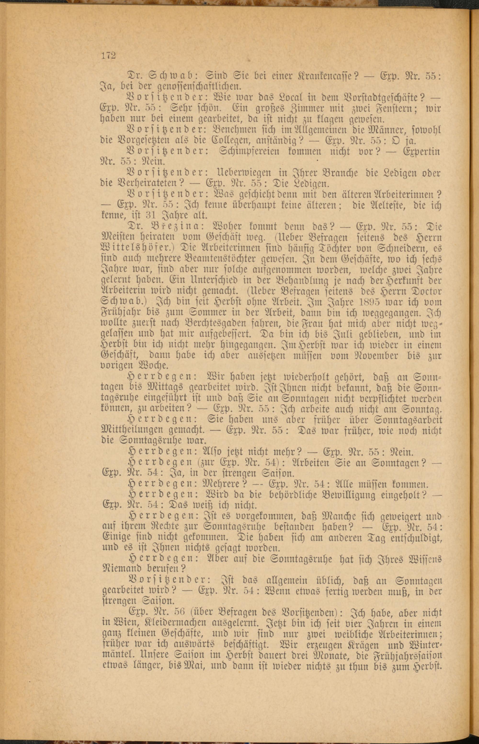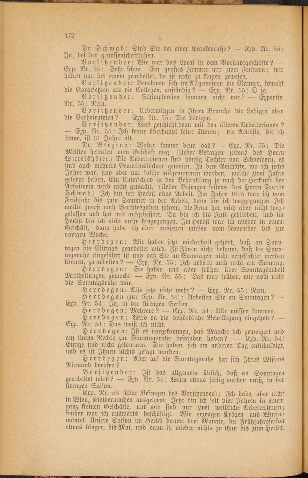 Exp. Nr. 56 (über Befragen des Vorsitzenden): Ich habe, aber nicht in Wien, Kleidermachen ausgelernt. Jetzt bin ich seit vier Jahren in einem ganz kleinen Geschäfte, und wir sind nur zwei weibliche Arbeiterinnen; früher war ich auswärts beschäftigt. Wir erzeugen Krägen und Winter- mäntel. Unsere Saison im Herbst dauert drei Monate, die Frühjahrssaison etwas länger, bis Mai, und dann ist wieder nichts zu thun bis zum Herbst.