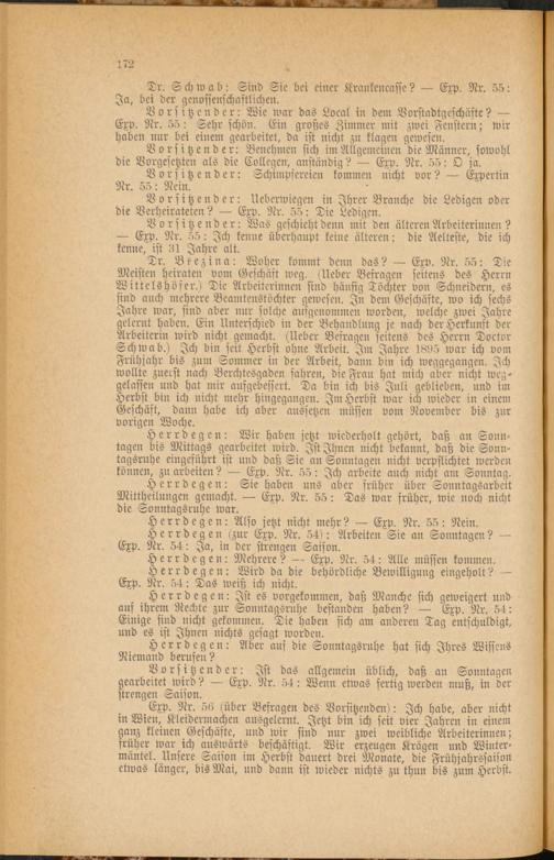 Herrdegen: Ist es vorgekommen, daß Manche sich geweigert und aus ihrem Rechte zur Sonntagsruhe bestanden haben? — Exp. Nr. 54: Einige sind nicht gekommen. Die haben sich am anderen Tag entschuldigt, und es ist Ihnen nichts gesagt worden.