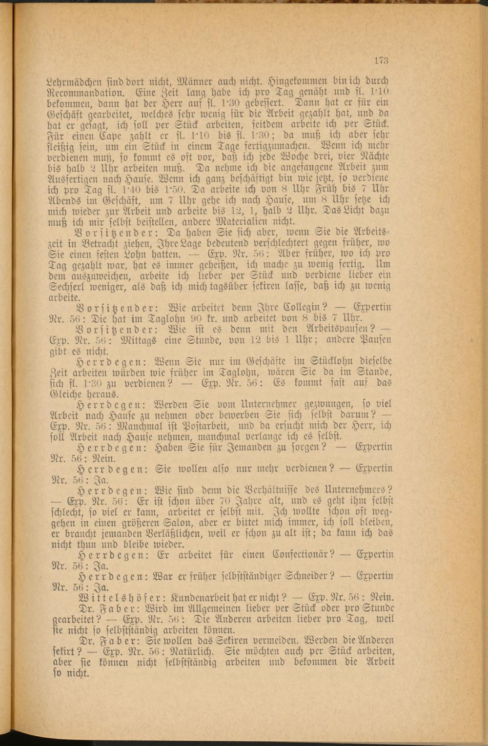 Herrdegen: Wenn Sie nur im Geschäfte im Stücklohn dieselbe Zeit arbeiten würden wie früher im Taglohn, wären Sie da im Stande, sich fl. l'50 zu verdienen? — Exp. Nr. 56: Es kommt fast aus das Gleiche heraus.