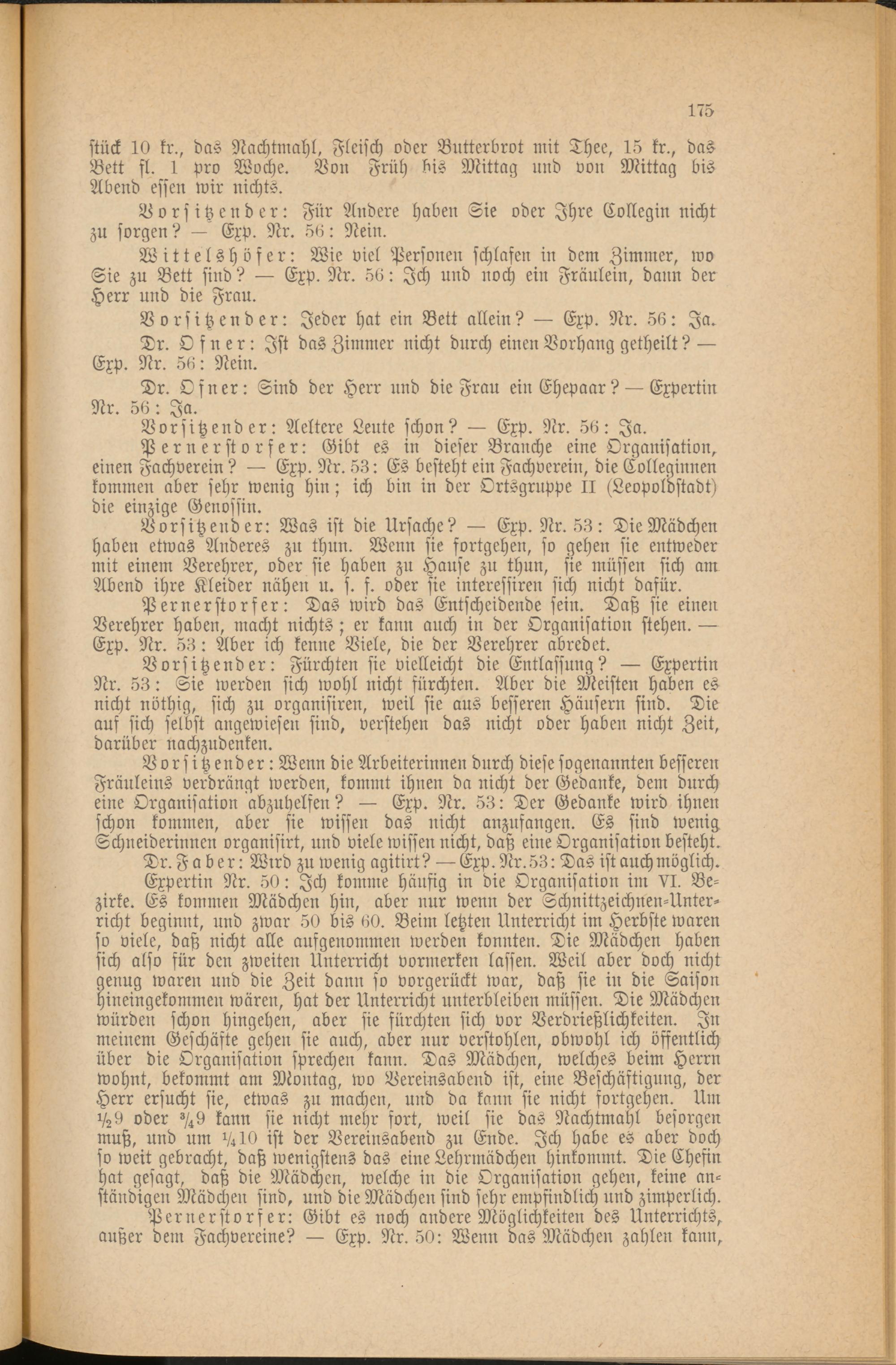 Vorsitzender: Fürchten sie vielleicht die Entlassung? — Expertin Nr. 53: Sie werden sich wohl nicht fürchten. Aber die Meisten haben es nicht nöthig, sich zu organisiren, weil sie aus besseren Häusern sind. Die auf sich selbst angewiesen sind, verstehen das nicht oder haben nicht Zeit, darüber nachzudenken.