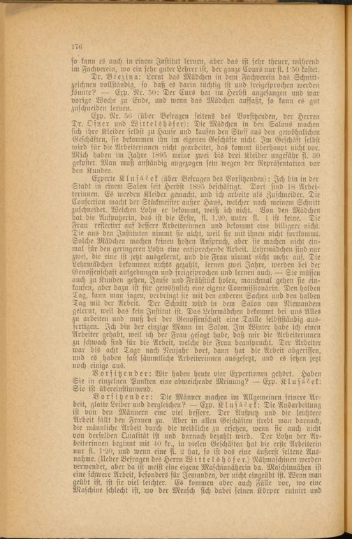 Exp. Nr. 56 (über Befragen seitens des Vorsitzenden, der Herren Dr. Ofner und Wittelsh öfer): Die Mädchen in den Salons machen sich ihre Kleider selbst zu Hause und kaufen den Stoff aus den gewöhnlichen Geschäften, sie bekommen ihn im eigenen Geschäfte nicht. Im Geschäft selbst wird für die Arbeiterinnen nicht gearbeitet, das kommt überhaupt nicht vor. Mich haben im Jahre 1895 meine zwei bis drei Kleider ungefähr st. 30 gekostet. Man muß anständig angezogen sein wegen der Repräsentation vor den Kunden.