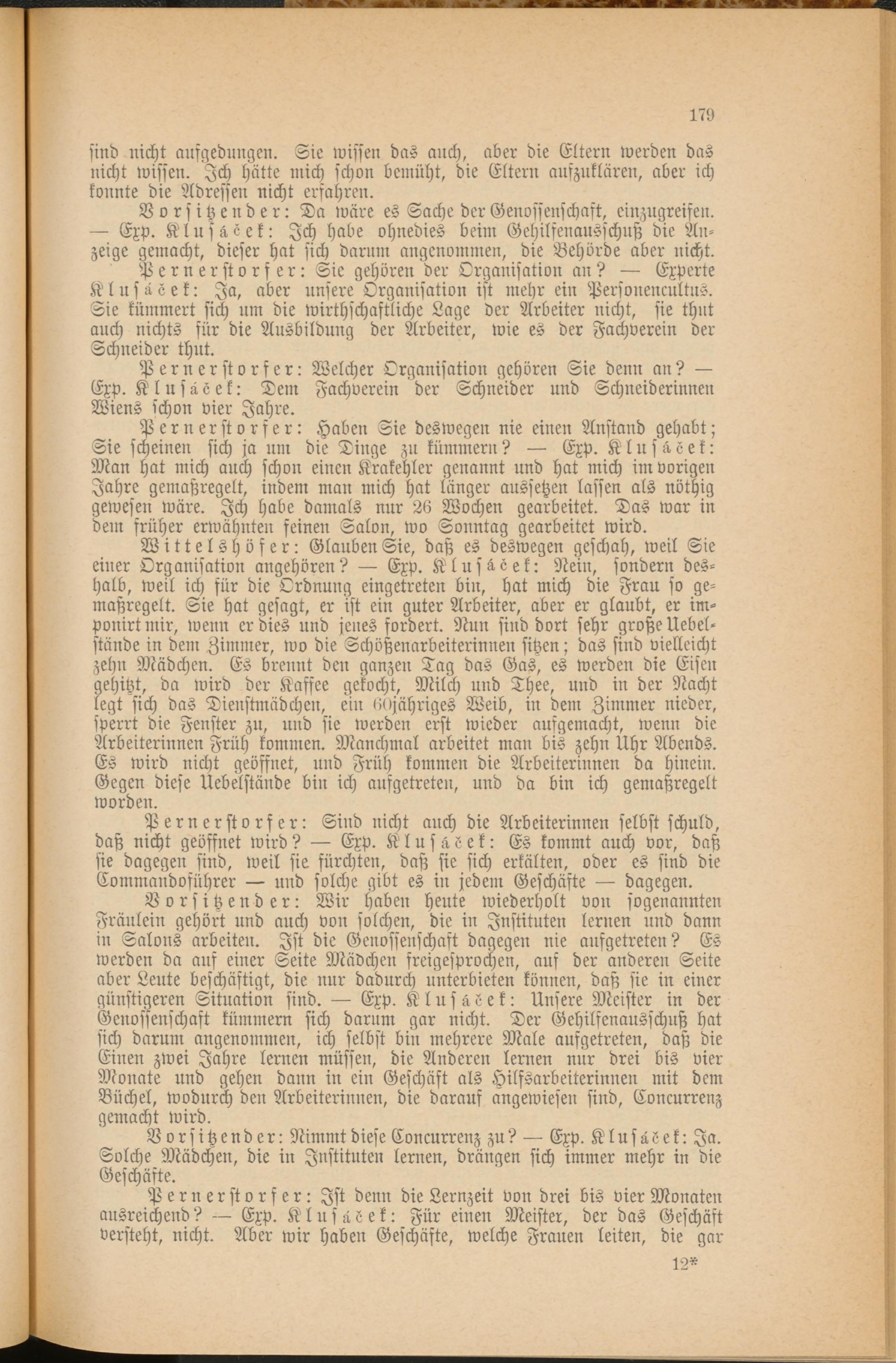 Pernerstorfer: Sind nicht auch die Arbeiterinnen selbst schuld, daß nicht geöffnet wird? — Exp. Klusäöek: Es kommt auch vor, daß sie dagegen sind, weil sie fürchten, daß sie sich erkälten, oder es sind die Commandoführer — und solche gibt es in jedem Geschäfte — dagegen.