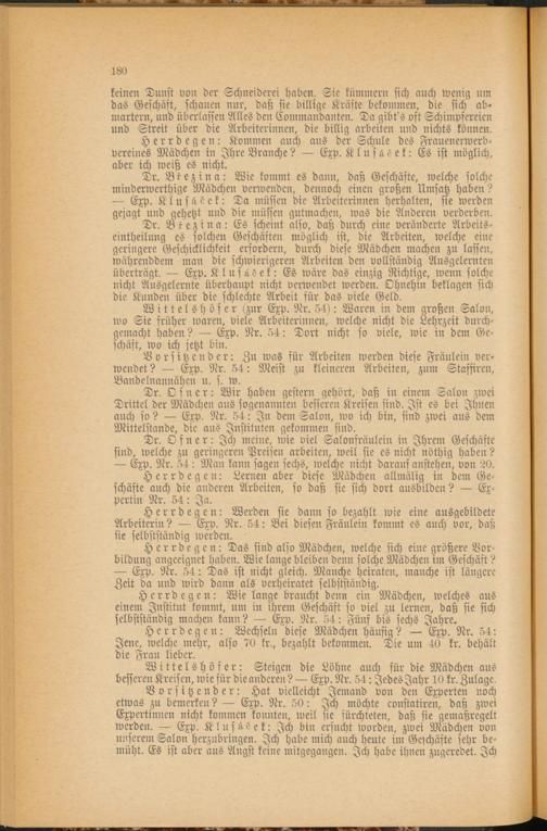 Dr. Ofner: Wir haben gestern gehört, daß in einem Salon zwei Drittel der Mädchen aus sogenannten besseren Kreisen sind. Ist es bei Ihnen auch so? — Exp. Nr. 54: In dem Salon, wo ich bin, sind zwei aus dem Mittelstände, die aus Instituten gekommen sind.