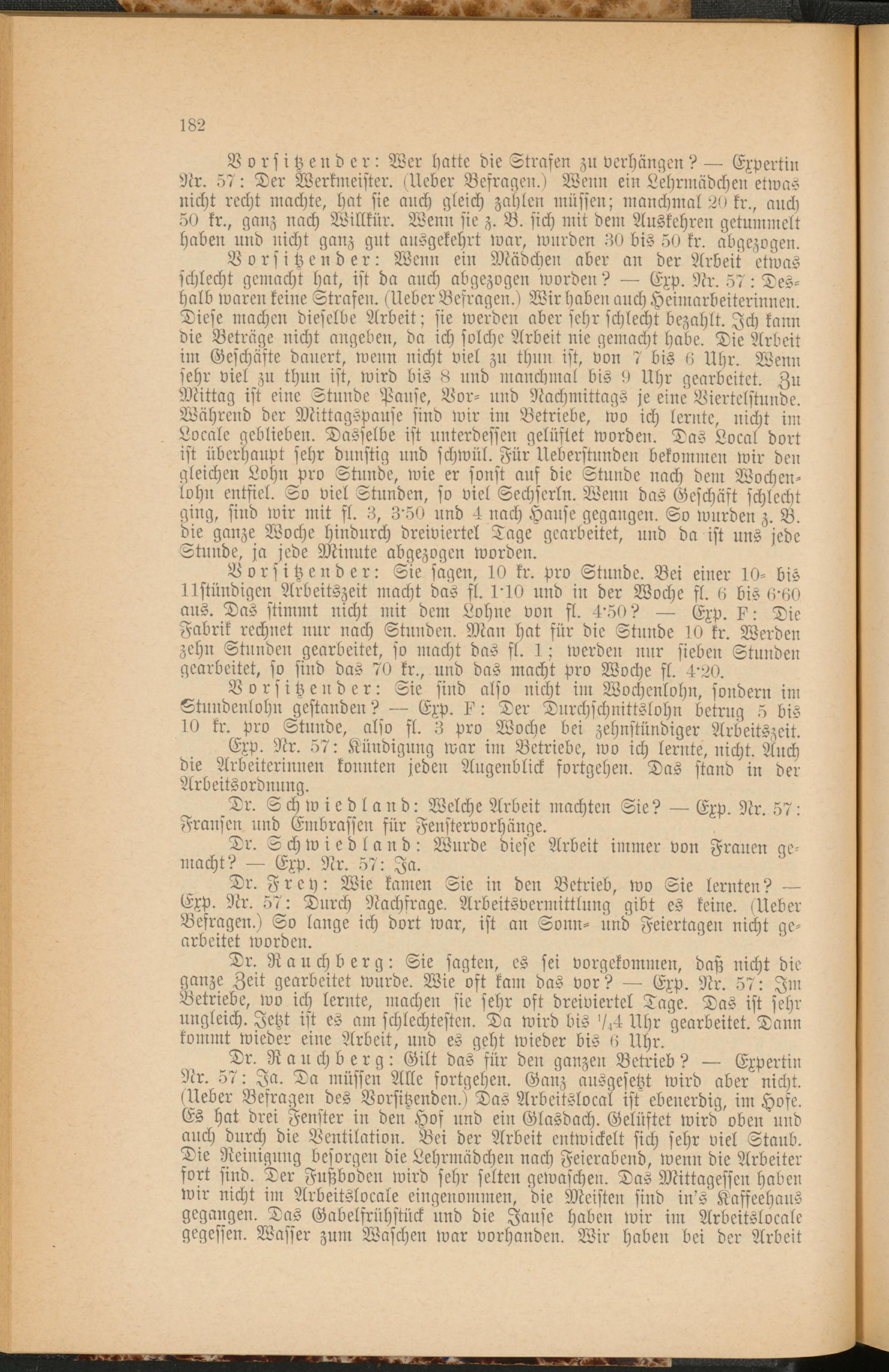 Vorsitzender: Wer hatte die Strafen zu verhängen? — Expertin Nr. 57: Der Werkmeister. «Ueber Befragen.) Wenn ein Lehrmädchen etwas nicht recht machte, hat sie auch gleich zahlen müssen; manchmal 20 kr., auch 50 kr., ganz nach Willkür. Wenn sie z. B. sich mit dem Auskehren getummelt haben und nicht ganz gut ausgekehrt war, wurden 50 bis 50 kr. abgezogen.