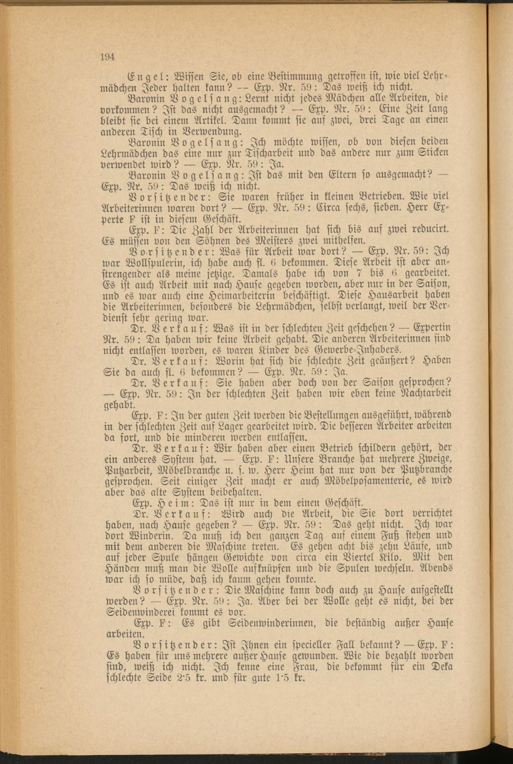 Vorsitzender: Was für Arbeit war dort? Exp. Nr. 59: Ich war Wollspulerin, ich habe auch fl. 6 bekommen. Diese Arbeit ist aber an­strengender als meine jetzige. Damals habe ich von 7 bis 6 gearbeitet. Es ist auch Arbeit mit nach Hause gegeben worden, aber nur in der Saison, und es war auch eine Heimarbeiterin beschäftigt. Diese Hausarbeit haben die Arbeiterinnen, besonders die Lehrmädchen, selbst verlangt, weil der Ver­dienst sehr gering war.