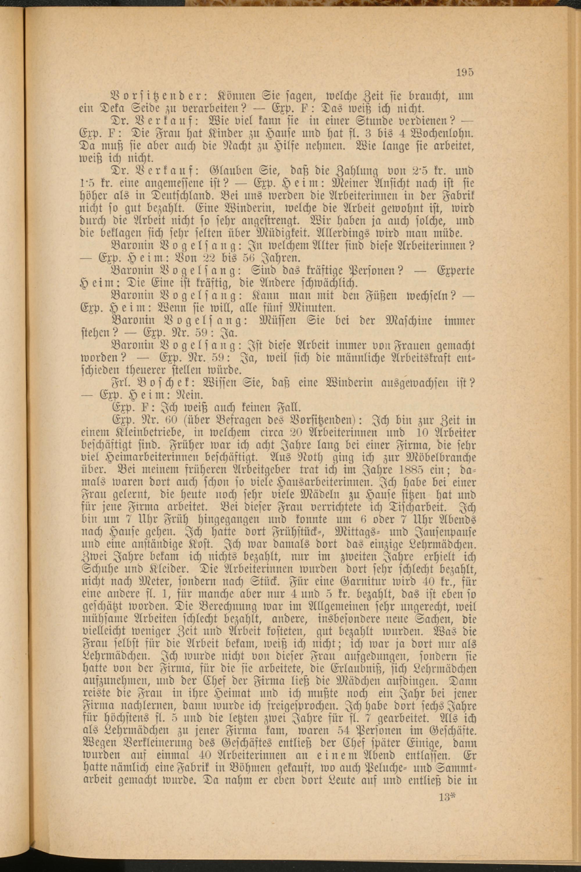 Dr. Verkauf: Glauben Sie, daß die Zahlung von 2 5 kr. und 15 kr. eine angemessene ist? — Exp. Heim: Meiner Ansicht nach ist sie höher als in Deutschland. Bei uns werden die Arbeiterinnen in der Fabrik nicht so gut bezahlt. Eine Winderin, welche die Arbeit gewohnt ist, wird durch die Arbeit nicht so sehr angestrengt. Wir haben ja auch solche, und die beklagen sich sehr selten über Müdigkeit. Allerdings wird man müde.