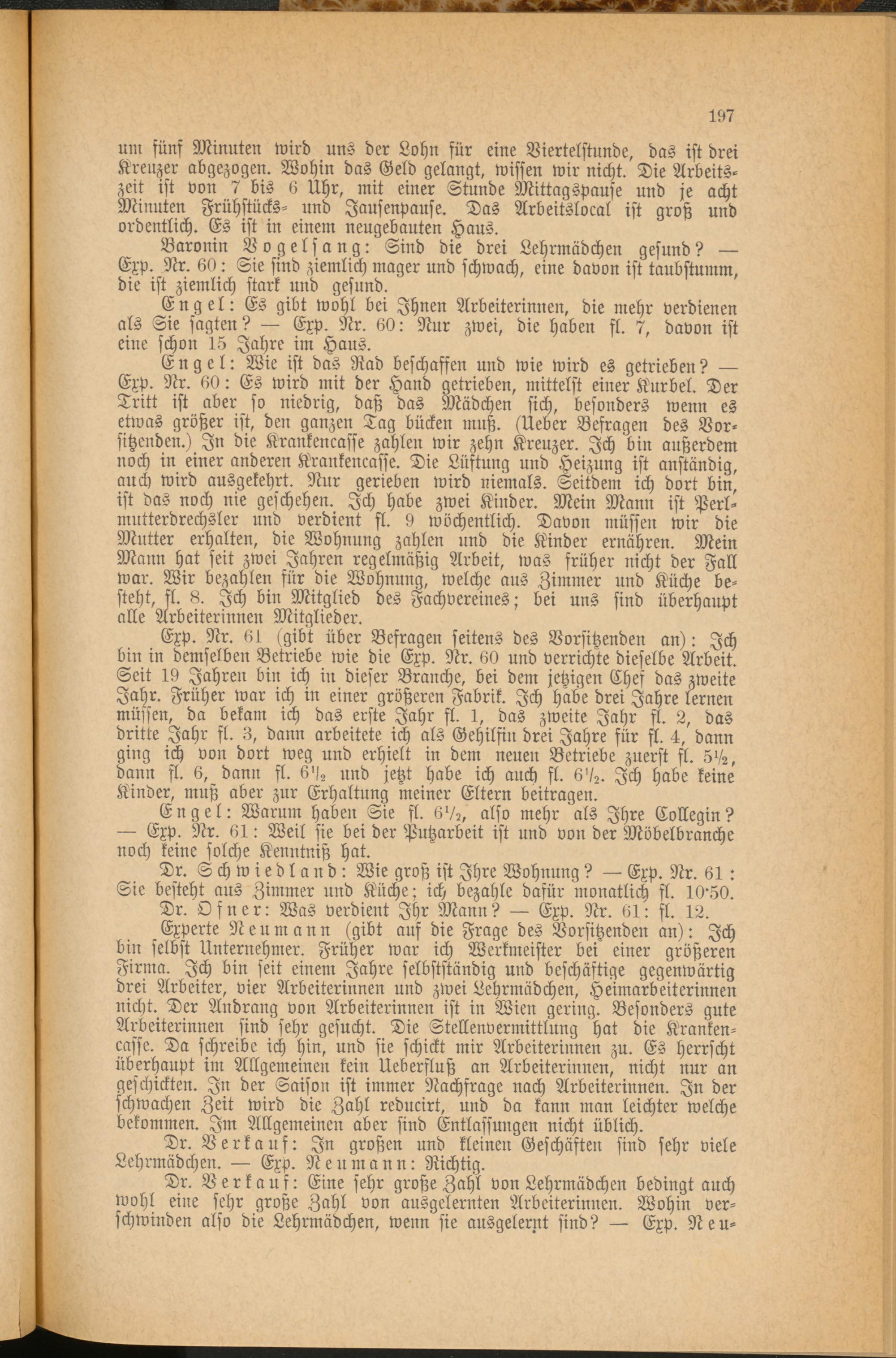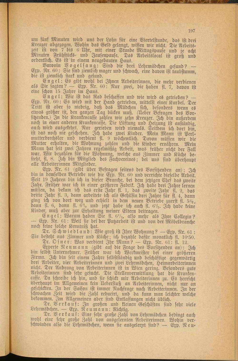 Engel: Es gibt wohl bei Ihnen Arbeiterinnen, die mehr verdienen als Sie sagten? — Exp. Nr. 60: Nur zwei, die haben fl. 7, davon ist eine schon 15 Jahre im Haus.
