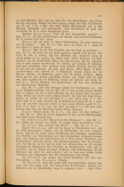 Dr. Schwiedland: Wie groß ist Ihre Wohnung? — Exp. Nr. 61 : Sie besteht aus Zimmer und Küche; ich bezahle dafür monatlich fl. 1050.