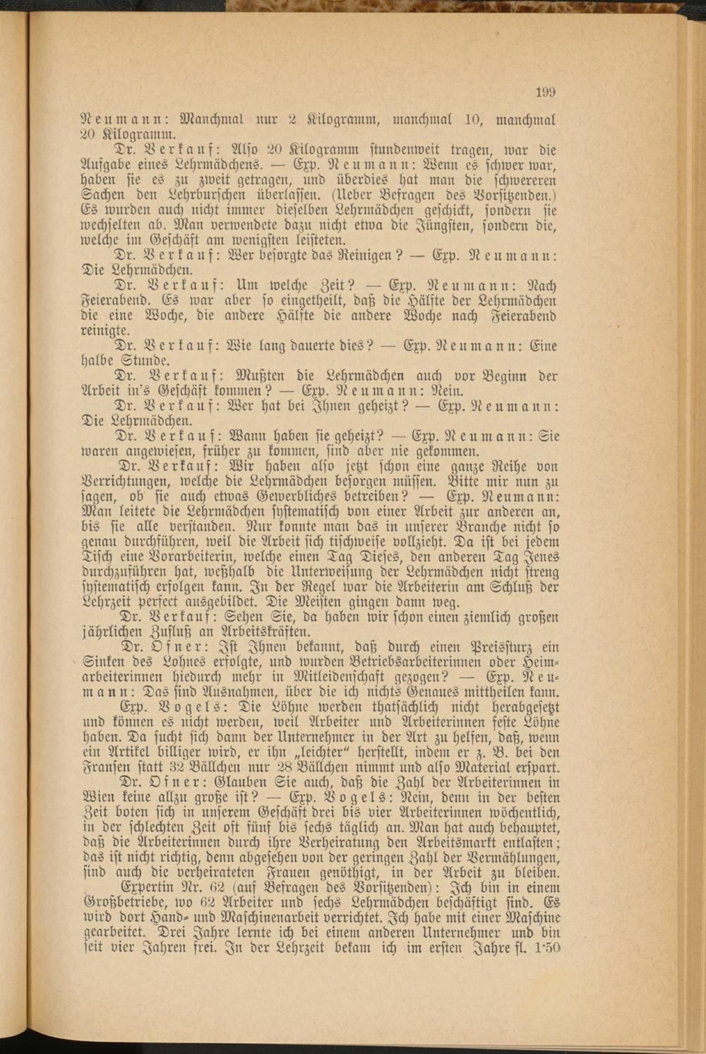 Dr. Ofner: Glauben Sie auch, daß die Zahl der Arbeiterinnen in Wien keine allzu große ist? Exp. Vogels: Nein, denn in der besten Zeit boten sich in unserem Geschäft drei bis vier Arbeiterinnen wöchentlich, in der schlechten Zeit oft fünf bis sechs täglich an. Man hat auch behauptet, daß die Arbeiterinnen durch ihre Verheiratung den Arbeitsmarkt entlasten; das ist nicht richtig, denn abgesehen von der geringen Zahl der Vermählungen, sind auch die verheirateten Frauen genöthigt, in der Arbeit zu bleiben.