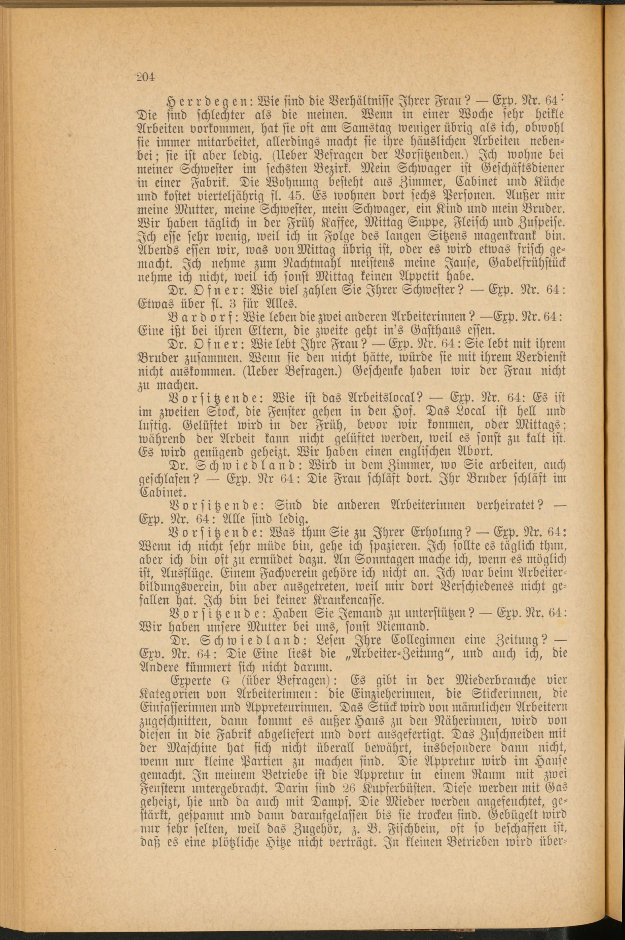 Herrdegen: Wie sind die Verhältnisse Ihrer Frau? — Exp. Nr. 64' Die sind schlechter als die meinen. Wenn in einer Woche sehr heikle Arbeiten vorkommen, hat sie oft am Samstag wenigerübrig als ich, obwohl sie immer mitarbeitet, allerdings macht sie ihre häuslichen Arbeiten nebenbei; sie ist aber ledig. «Jeder Befragen der Vorsitzenden.) Ich wohne bei meiner Schwester im sechsten Bezirk. Mein Schwager ist Geschäftsdiener in einer Fabrik. Die Wohnung besteht aus Zimmer, Cabinet und Küche und kostet vierteljährig sl. 45. Es wohnen dort sechs Personen. Außer mir meine Mutter, meine Schwester, mein Schwager, ein Kind und mein Bruder. Wir haben täglich in der Früh Kaffee, Mittag Suppe, Fleisch und Zuspeise. Ich esse sehr wenig, weil ich in Folge des langen Sitzens magenkrank bin. Abends essen wir, was von Mittag übrig ist, oder es wird etwas frisch gemacht. Ich nehme zum Nachtmahl meistens meine Jause, Gabelfrühstück nehme ich nicht, weil ich sonst Mittag keinen Appetit habe.