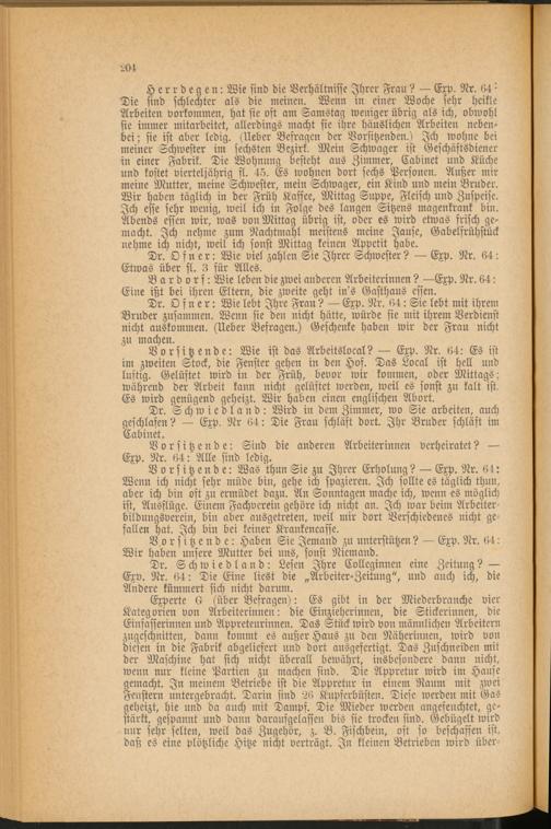 Vorsitzende: Wie ist das Arbeitslocal? — Exp. Nr. 64: Es ist im zweiten Stock, die Fenster gehen in den Hos. Das Local ist hell und luftig. Gelüftet wird in der Früh, bevor wir kommen, oder Mittags; während der Arbeit kann nicht gelüstet werden, weil es sonst zu kalt ist. Es wird genügend geheizt. Wir haben einen englischen Abort.