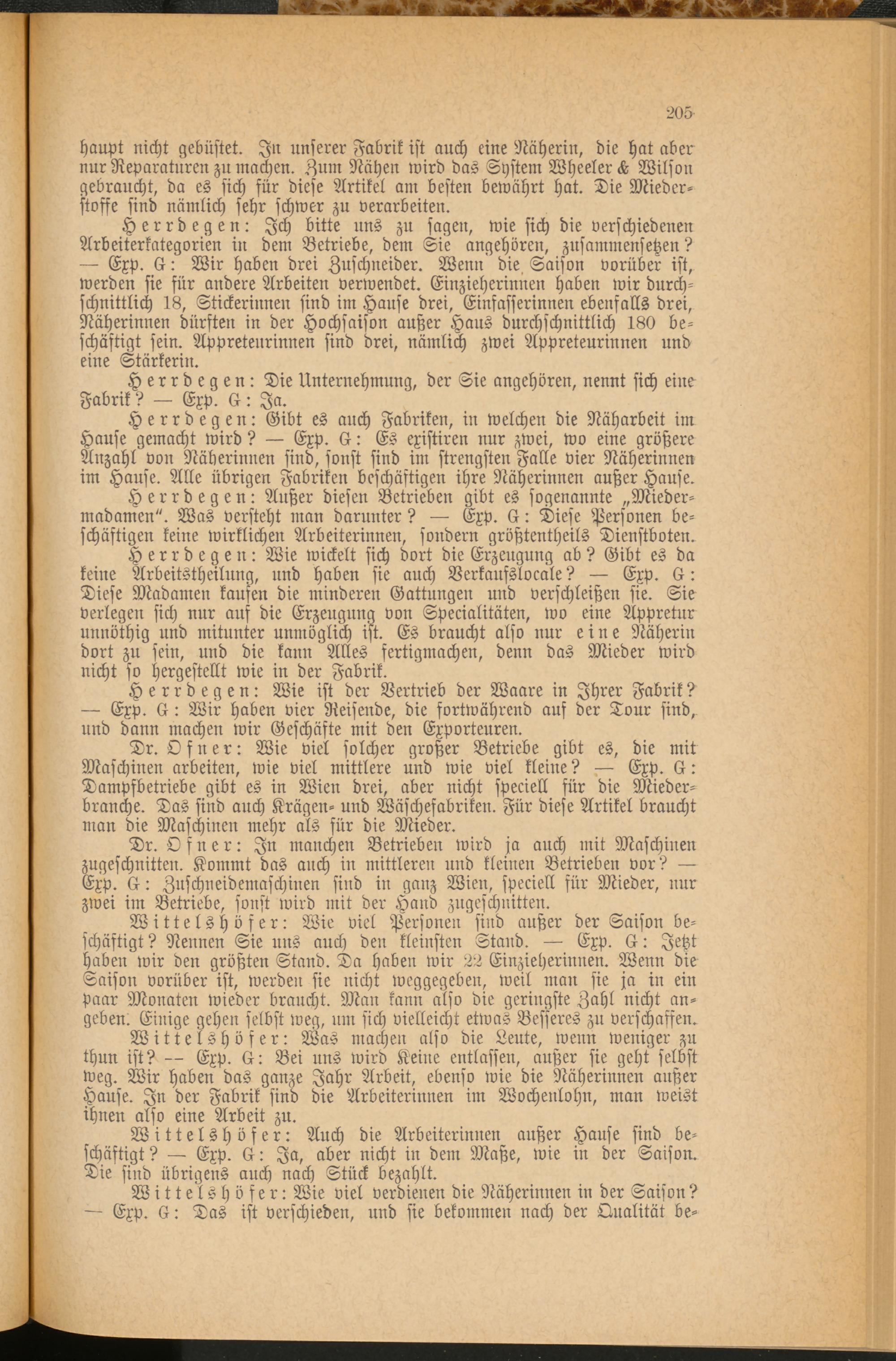 Wittelshöser: Was machen also die Leute, wenn weniger zu thun ist? — Exp. d: Bei uns wird Keine entlassen, außer sie geht selbst weg. Wir haben das ganze Jahr Arbeit, ebenso wie die Näherinnen außer Hause. In der Fabrik sind die Arbeiterinnen im Wochenlohn, man weist ihnen also eine Arbeit zu.