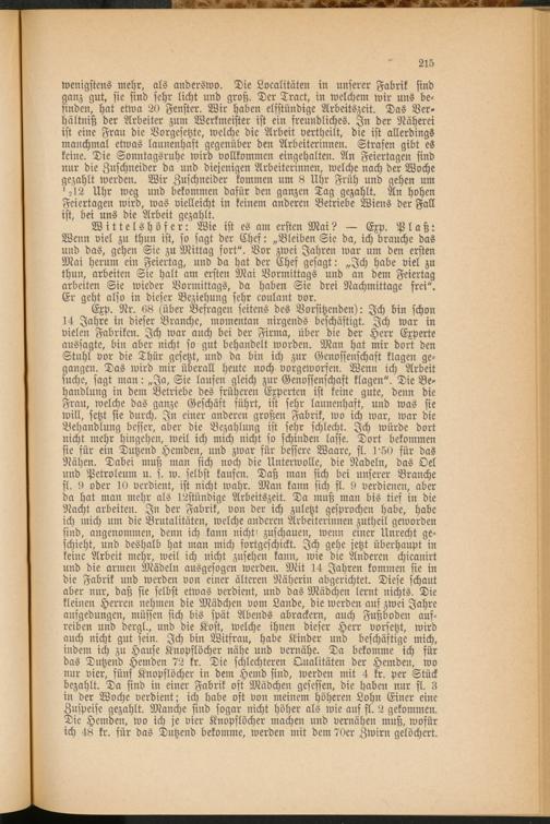 Exp. Nr. 68 (über Befragen seitens des Vorsitzenden): Ich bin schon 14 Jahre in dieser Branche, momentan nirgends beschäftigt. Ich war in vielen Fabriken. Ich war auch bei der Firma, über die der Herr Experte aussagte, bin aber nicht so gut behandelt worden. Man hat mir dort den Stuhl vor die Thür gesetzt, und da bin ich zur Genossenschaft klagen gegangen. Das wird mir überall heute noch vorgeworfen. Wenn ich Arbeit suche, sagt man: „Ja, Sie laufen gleich zur Genossenschaft klagen". Die Behandlung in dem Betriebe des früheren Experten ist keine gute, denn die Frau, welche das ganze Geschäft führt, ist sehr launenhaft, und was sie will, setzt sie durch. In einer anderen großen Fabrik, wo ich war, war die Behandlung besser, aber die Bezahlung ist sehr schlecht. Ich würde dort nicht mehr hingehen, weil ich mich nicht so schinden lasse. Dort bekommen sie für ein Dutzend Hemden, und zwar für bessere Waare, st. l'50 für das Nähen. Dabei muß man sich noch die Unterwolle, die Nadeln, das Oel und Petroleum u. s. w. selbst kaufen. Daß man sich bei unserer Branche fl. 9 oder 10 verdient, ist nicht wahr. Man kann sich st. 9 verdienen, aber da hat man mehr als 12stündige Arbeitszeit. Da muß man bis tief in die Nacht arbeiten. In der Fabrik, von der ich zuletzt gesprochen habe, habe ich mich um die Brutalitäten, welche anderen Arbeiterinnen zutheil geworden sind, angenommen, denn ich kann nicht! zuschauen, wenn einer Unrecht geschieht, und deshalb hat man mich fortgeschickt. Ich gehe jetzt überhaupt in keine Arbeit mehr, weil ich nicht zusehen kann, wie die Anderen chicanirt und die armen Mädeln ausgesogen werden. Mit 14 Jahren kommen sie in die Fabrik und werden von einer älteren Näherin abgerichtet. Diese schaut aber nur, daß sie selbst etwas verdient, und das Mädchen lernt nichts. Die kleinen Herren nehmen die Mädchen vom Lande, die werden auf zwei Jahre aufgedungen, müssen sich bis spät Abends abrackern, auch Fußboden aufreiben und dergl., und die Kost, welche ihnen dieser Herr vorsetzt, wird auch nicht gut sein. Ich bin Witfrau, habe Kinder und beschäftige mich, indem ich zu Hause Knopflöcher nähe und vernähe. Da bekomme ich für das Dutzend Hemden 72 kr. Die schlechteren Qualitäten der Hemden, wo nur vier, fünf Knopflöcher in dem Hemd sind, werden mit 4 kr. per Stück bezahlt. Da sind in einer Fabrik oft Mädchen gesessen, die haben nur fl. 3 in der Woche verdient; ich habe oft von meinem höheren Lohn Einer eine Zuspeise gezahlt. Manche sind sogar nicht höher als wie auf fl. 2 gekommen. Die Hemden, wo ich je vier Knopflöcher machen und vernähen muß, wofür ich 48 kr. für das Dutzend bekomme, werden mit dem 70er Zwirn gelöchert.