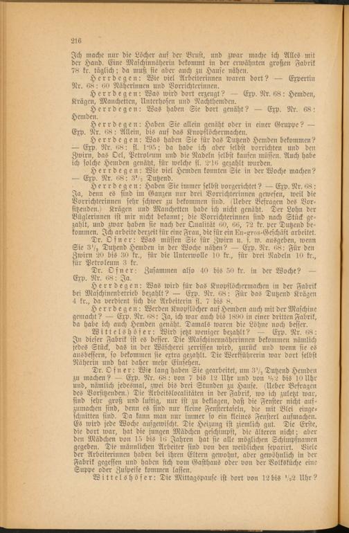 Dr. Ofner: Wie lang haben Sie gearbeitet, um 3'/2 Dutzend Hemden zu machen? Exp. Nr. 68: von 7 bis 12 Uhr und von V 22 bis 10 Uhr und, nämlich jedesmal, zwei bis drei Stunden zu Hause. (Ueber Befragen des Vorsitzenden.) Die Arbeitslocalitäten in der Fabrik, wo ich zuletzt war, sind sehr groß und luftig, nur ist zu beklagen, daß die Fenster nicht auf­zumachen sind, denn es sind nur kleine Fenstertafeln, die mit Blei einge­schulten sind. Da kann man nur immer so ein kleines Fensterl ausmachen. Es wird jede Woche ausgewischt. Die Heizung ist ziemlich gut. Die Erste, die dort war, hat die jungen Mädchen geschimpft, die älteren nicht; aber den Mädchen von 15 bis 16 Jahren hat sie alle möglichen Schimpfnamen gegeben. Die männlichen Arbeiter sind von den weiblichen separirt. Viele der Arbeiterinnen haben bei ihren Eltern gewohnt, aber gewöhnlich in der Fabrik gegessen und haben sich vom Gasthaus oder von der Volksküche eine Suppe oder Zuspeise kommen lassen.