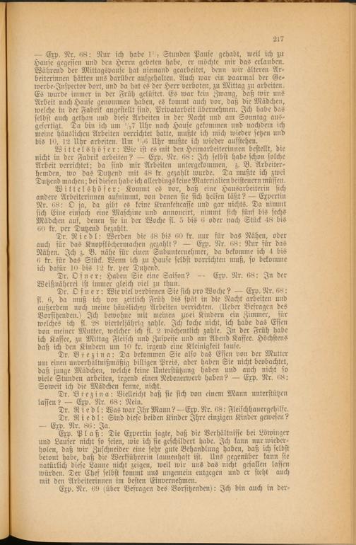 W i t t el s h ö s er: Wie ist es mit den Heimarbeiterinnen bestellt, die nicht in der Fabrik arbeiten? — Exp. Nr. 68 : Ich selbst habe schon solche Arbeit verrichtet; da sind mir Arbeiten untergekommen, z. B. Arbeiterhemden, wo das Dutzend mit 48 kr. gezahlt wurde. Da mußte ich zwei Dutzend machen; bei diesen habe ich allerdings keine Materialien beisteuern müssen.