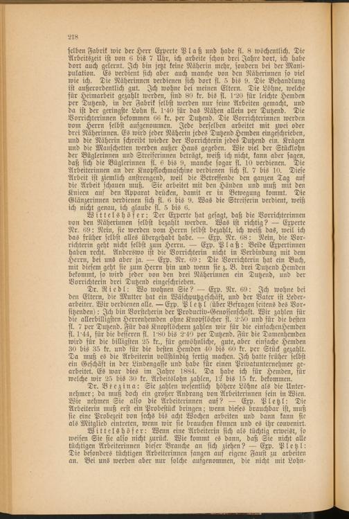 selben Fabrik wie der Herr Experte Plaß und habe fl. 8 wöchentlich. Die Arbeitszeit ist von 6 bis 7 Uhr, ich arbeite schon drei Jahre dort, ich habe dort auch gelernt. Ich bin jetzt keine Näherin mehr, sondern bei der Manipulation. Es verdient sich aber auch manche von den Näherinnen so viel wie ich. Die Näherinnen verdienen sich dort fl. 5 bis 9. Die Behandlung ist außerordentlich gut. Ich wohne bei meinen Eltern. Die Löhne, welche für Heimarbeit gezahlt werden, sind 80 kr. bis fl. 1'20 für leichte Hemden Per Dutzend, in der Fabrik selbst werden nur feine Arbeiten gemacht, und da ist der geringste Lohn fl. 1'40 für das Nähen allein per Dutzend. Die Vorrichterinnen bekommen 66 kr. per Dutzend. Die Vorrichterinnen werden vom Herrn selbst aufgenommen. Jede derselben arbeitet mit zwei oder drei Näherinnen. Es wird jeder Näherin jedes Dutzend Hemden eingeschrieben, und die Näherin schreibt wieder der Vorrichterin jedes Dutzend ein. Krägen und die Manschetten werden außer Haus gegeben. Wie viel der Stücklohn der Büglerinnen und Streiferinnen beträgt, weiß ich nicht, kann aber sagen, daß sich die Büglerinnen fl. 6 bis 9, manche sogar fl. 10 verdienen. Die Arbeiterinnen an der Knopflochmaschine verdienen sich fl. 7 bis 10. Diese Arbeit ist ziemlich anstrengend, weil die Betreffende den ganzen Tag auf die Arbeit schauen muß. Sie arbeitet mit den Händen und muß mit den Knieen auf den Apparat drücken, damit er in Bewegung kommt. Die Glänzerinnen verdienen sich fl. 6 bis 9. Was die Streiferin verdient, weiß ich nicht genau, ich glaube fl. 5 bis 6.