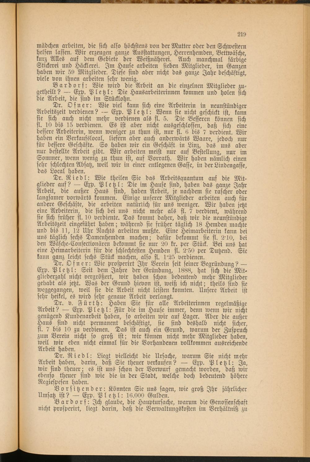 Dr. Ofner: Wie prosperirt Ihr Verein seit seiner Begründung? Exp. Pletzl: Seit dem Jahre der Gründung, 1888, hat sich die Mit­gliederzahl nicht vergrößert, wir haben schon bedeutend mehr Mitglieder gehabt als jetzt. Was der Grund hievon ist, weiß ich nicht; theils sind sie weggegangen, weil sie die Arbeit nicht leisten konnten. Unsere Arbeit ist sehr heikel, es wird sehr genaue Arbeit verlangt.