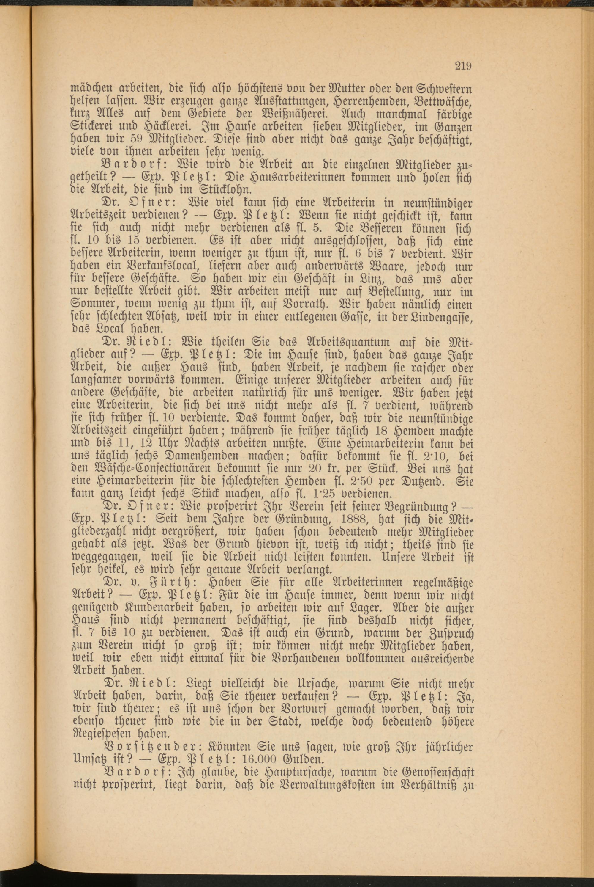 Dr. v. Fürth: Haben Sie für alle Arbeiterinnen regelmäßige Arbeit? Exp. Pletzl: Für die im Hause immer, denn wenn wir nicht genügend Kundenarbeit haben, so arbeiten wir auf Lager. Aber die außer Haus sind nicht permanent beschäftigt, sie sind deshalb nicht sicher, fl. 7 bis 10 zu verdienen. Das ist auch ein Grund, warum der Zuspruch zum Verein nicht so groß ist; wir können nicht mehr Mitglieder haben, weil wir eben nicht einmal für die Vorhandenen vollkommen ausreichende Arbeit haben.