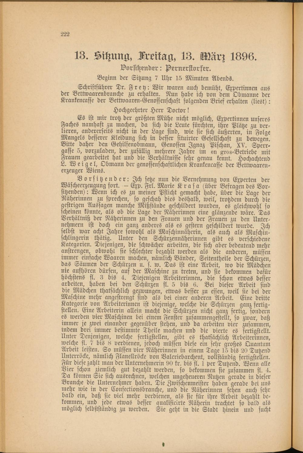Schriftführer Dr. Frey: Wir waren auch bemüht, Expertinnen aus der Bettwaarenbranche zu erhalten. Nun habe ich von dem Obmanne der Krankencasfe der Bettwaaren-Genossenschaft folgenden Brief erhalten (liest):