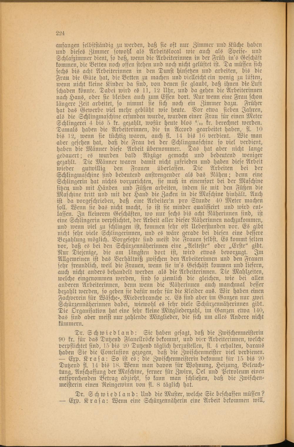 — Exp. Krasa: So ist es; die Zwischenmeisterin bekommt für 15 bis 20 Dutzend fl. 14 bis 18. Wenn man davon für Wohnung, Heizung, Beleuchtung, Anschaffung der Maschine, ferner für Zwirn, Oel und Petroleum einen entsprechenden Betrag abzieht, so kann man schließen, daß die Zwischenmeisterin einen Reingewinn von fl. 8 täglich hat.