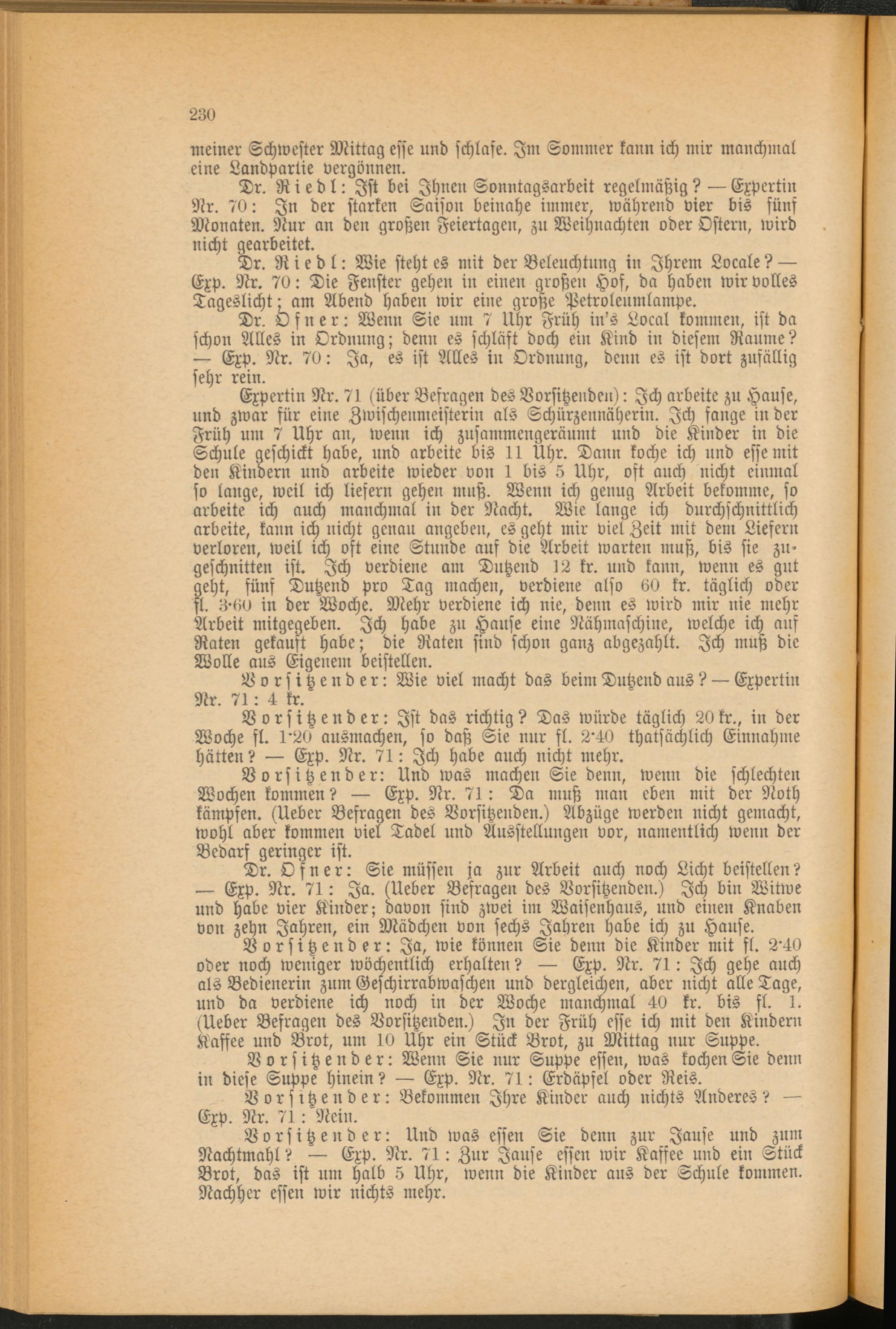 Vorsitzender: Ja, wie können Sie denn die Kinder mit fl. 2'40 oder noch weniger wöchentlich erhalten? — Exp. Nr. 71: Ich gehe auch als Bedienerin zum Geschirrabwaschen und dergleichen, aber nicht alle Tage, und da verdiene ich noch in der Woche manchmal 40 kr. bis fl. 1. (Ueber Befragen des Vorsitzenden.) In der Früh esse ich mit den Kindern Kaffee und Brot, um 10 Uhr ein Stück Brot, zu Mittag nur Suppe.