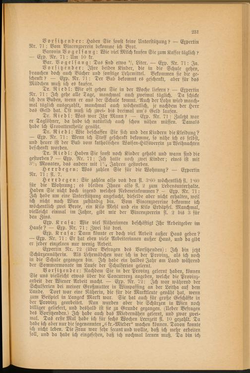 Herrdegen: Sie zahlen also von den fl. 3'60 wöchentlich fl. 1 ' 6 tt für die Wohnung; es bleiben Ihnen also fl. 2 zum Lebensunterhalte. Haben Sie nicht doch irgend welches Nebeneinkommen? — Exp. Nr. 71: Ich habe um eine Unterstützung angesucht, dieselbe aber nicht erhalten, weil ich nicht nach Wien zuständig bin. Vom Vincenzvereine bekomme ich wöchentlich zwei Brote, ein Kilo Mehl und ein Kilo Erdäpfel. Manchmal, vielleicht einmal im Jahre, gibt mir der Vincenzverein fl. 2 bis 3 für den Zins.
