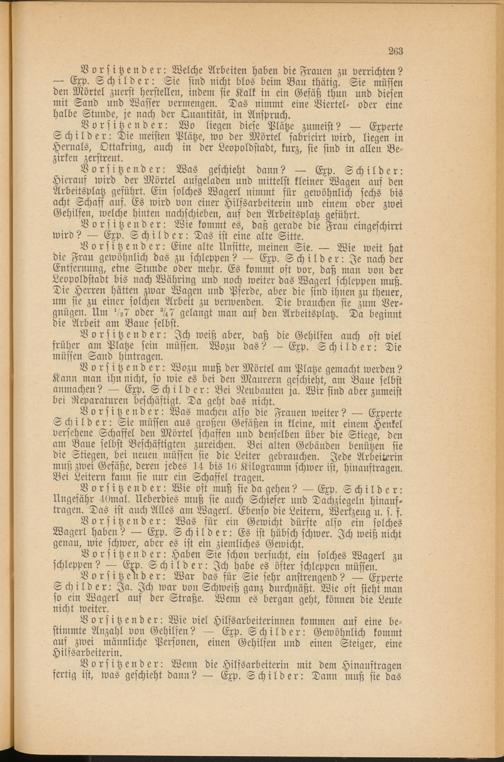 Vorsitzender: Eine alte Unsitte, meinen Sie. — Wie weit hat die Frau gewöhnlich das zu schleppen? — Exp. Schilder: Je nach der Entfernung, eine Stunde oder mehr. Es kommt oft vor, daß man von der Leopoldstadt bis nach Währung und noch weiter das Wagerl schleppen muß. Die Herren hätten zwar Wagen und Pferde, aber die sind ihnen zu theuer, um sie zu einer solchen Arbeit zu verwenden. Die brauchen sie zum Vergnügen. Um bs7 oder V 47 gelangt man auf den Arbeitsplatz. Da beginnt die Arbeit am Baue selbst.