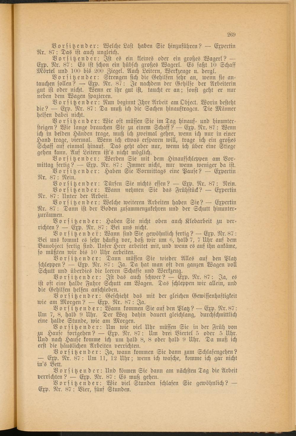 Vorsitzender: Wie oft müssen Sie im Tag hinauf- und Hinuntersteigen ? Wie lange brauchen Sie zu einem Schaff? — Exp. Nr. 87: Wenn ich in beiden Händen trage, muß ich zweimal gehen, wenn ich nur in einer Hand trage, viermal. Wenn ich etwas ersparen will, trage ich ein großes Schaff auf einmal hinaus. Das geht aber nur, wenn ich über eine Stiege gehen kann. Auf Leitern ist's nicht möglich.