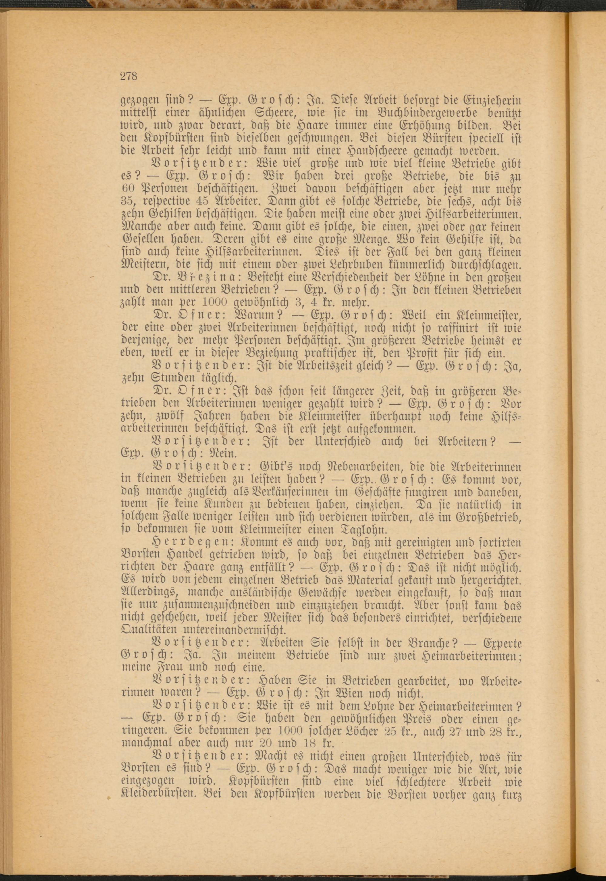 Dr. Bkezina: Besteht eine Verschiedenheit der Löhne in den großen und den mittleren Betrieben? — Exp. Grosch: In den kleinen Betrieben zahlt man per 1000 gewöhnlich 3, 4 kr. mehr.