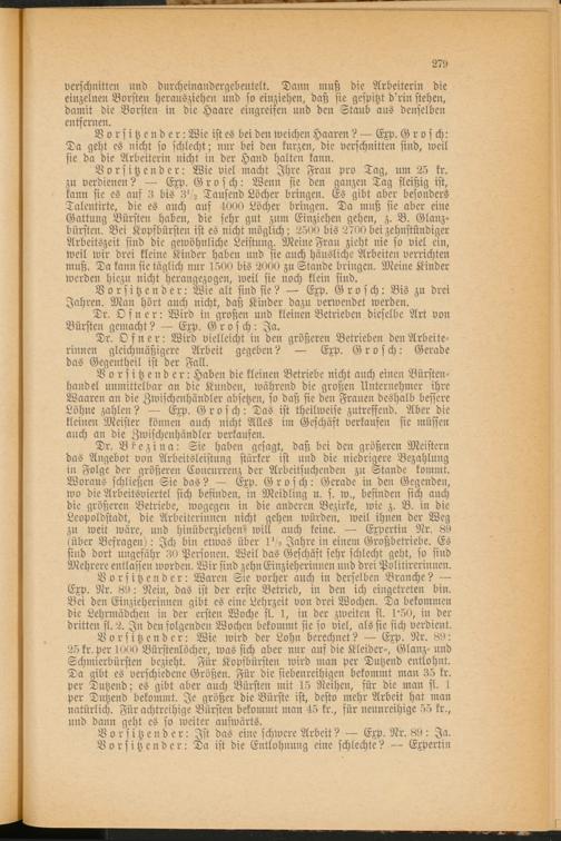 Vorsitzender: Wie wird der Lohn berechnet? — Exp. Nr. 89: 25kr.per 1000 Bürstenlöcher, was sich aber nur auf die Kleider-, Glanz-und Schmierbürsten bezieht. Für Kopfbürsten wird man per Dutzend entlohnt. Da gibt es verschiedene Größen. Für die siebenreihigen bekommt man 35 kr. per Dutzend; es gibt aber auch Bürsten mit 15 Reihen, für die man fl. 1 per Dutzend bekommt. Je größer die Bürste ist, desto mehr Arbeit hat man natürlich. Für achtreihige Bürsten bekommt man 45 kr., für neunreihige 55 kr., und dann geht es so weiter aufwärts.