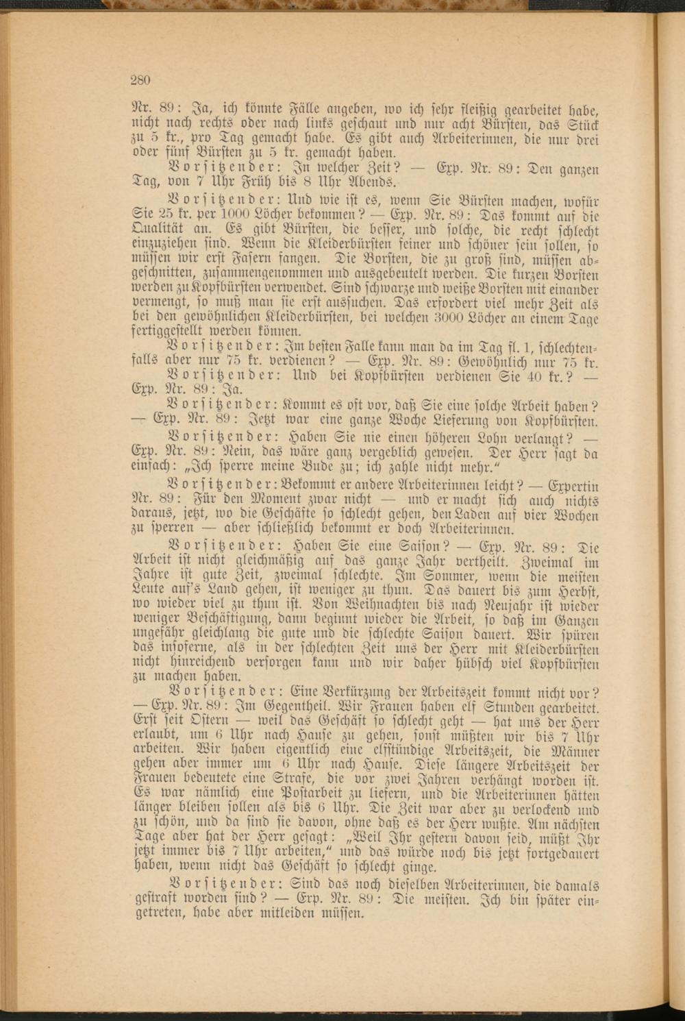 Nr. 89: Ja, ich könnte Fälle angeben, wo ich sehr fleißig gearbeitet habe, nicht nach rechts oder nach links geschaut und nur acht Bürsten, das Stück zu 5 kr., pro Tag gemacht habe. Es gibt auch Arbeiterinnen, die nur drei oder fünf Bürsten zu 5 kr. gemacht haben.