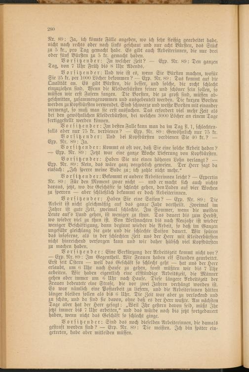 Vorsitzender: Haben Sie eine Saison? — Exp. Nr. 89: Die Arbeit ist nicht gleichmäßig aus das ganze Jahr vertheilt. Zweimal im Jahre ist gute Zeit, zweimal schlechte. Im Sommer, wenn die meisten Leute aufs Land gehen, ist weniger zu thun. Das dauert bis zum Herbst, wo wieder viel zu thun ist. Von Weihnachten bis nach Neujahr ist wieder weniger Beschäftigung, dann beginnt wieder die Arbeit, so daß im Ganzen ungefähr gleichlang die gute und die schlechte Saison dauert. Wir spüren das insoferne, als in der schlechten Zeit uns der Herr mit Kleiderbürsten nicht hinreichend versorgen kann und wir daher hübsch viel Kopfbürsten zu machen haben.