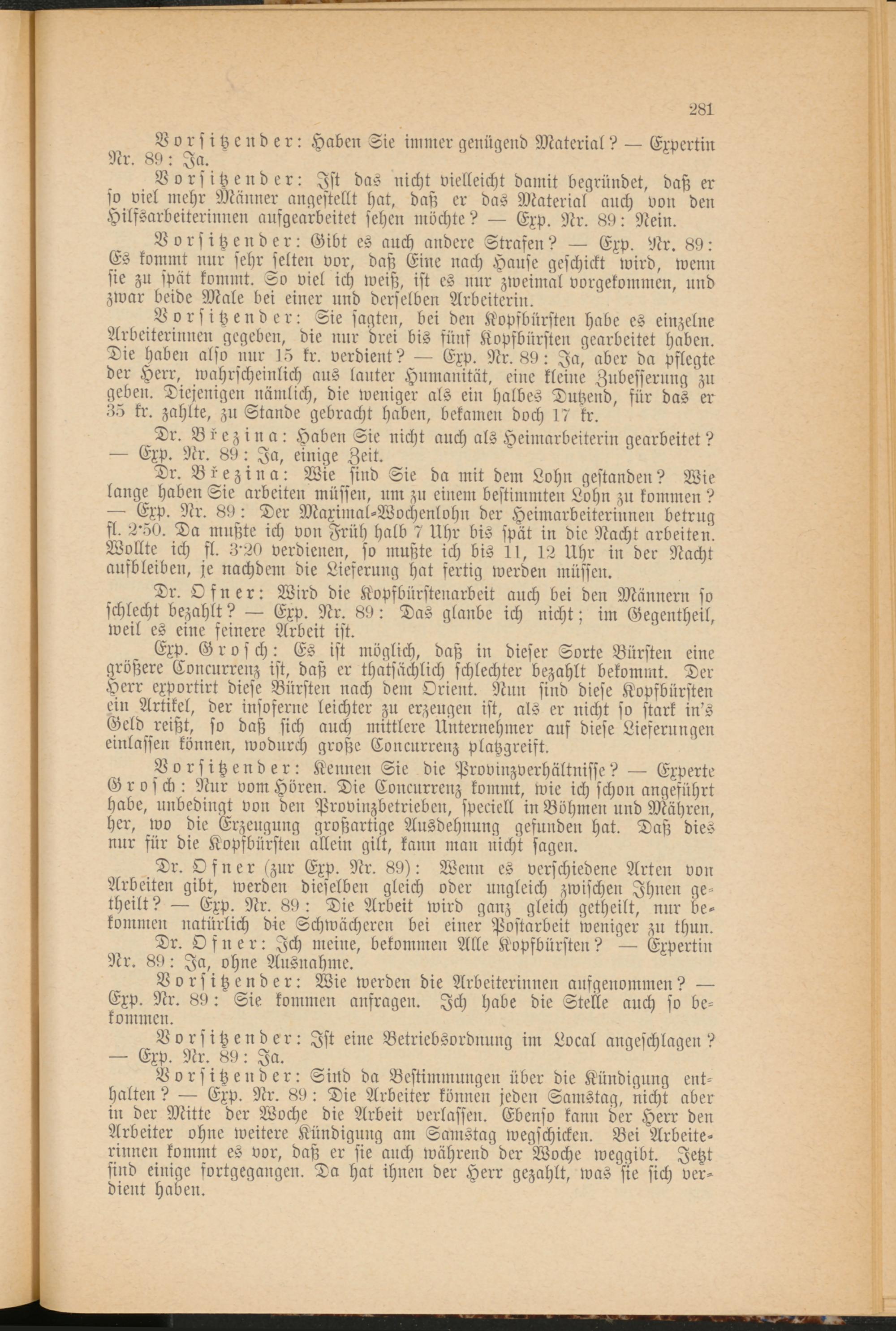 Dr. Ofner: Wird die Kopfbürstenarbeit auch bei den Männern so schlecht bezahlt? — Exp. Nr. 89: Das glaube ich nicht; im Gegentheil, weil es eine feinere Arbeit ist.