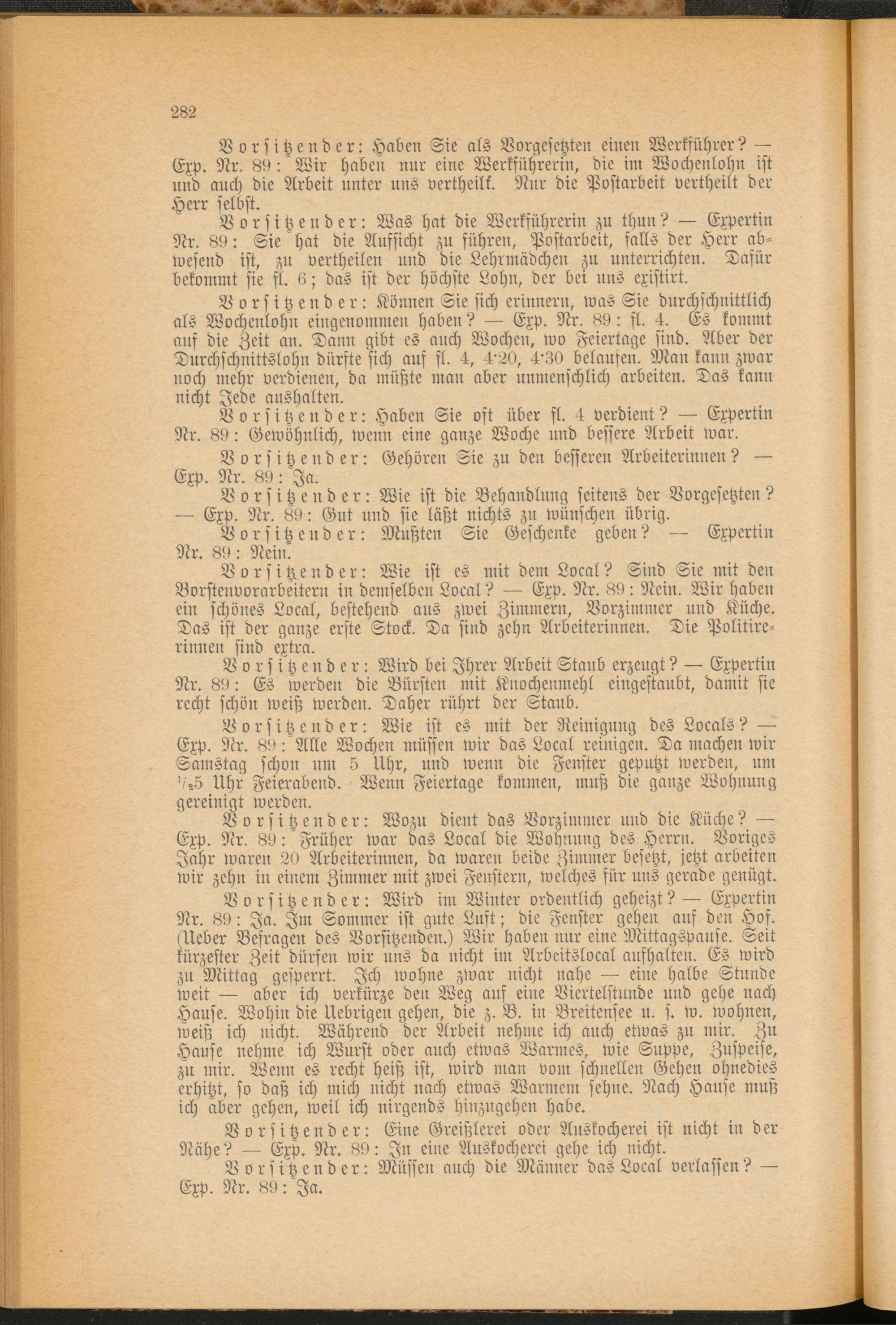 Vorsitzender: Wird im Winter ordentlich geheizt? Expertin Nr. 89: Ja. Im Sommer ist gute Luft; die Fenster gehen aus den Hof. (Ueber Befragen des Vorsitzenden.) Wir haben nur eine Mittagspause. Seit kürzester Zeit dürfen wir uns da nicht im Arbeitslocal aufhalten. Es wird zu Mittag gesperrt. Ich wohne zwar nicht nahe eine halbe Stunde weit aber ich verkürze den Weg auf eine Viertelstunde und gehe nach Haufe. Wohin die klebrigen gehen, die z. B. in Breitensee n. s. w. wohnen, weiß ich nicht. Während der Arbeit nehme ich auch etwas zu mir. Zu Hause nehme ich Wurst oder auch etwas Warmes, wie Suppe, Zuspeise, zu nur. Wenn es recht heiß ist, wird man von: schnellen Gehen ohnedies erhitzt, so daß ich mich nicht nach etwas Warmen: sehne. Nach Hause muß ich aber gehen, weil ich nirgends hinzugehen habe.