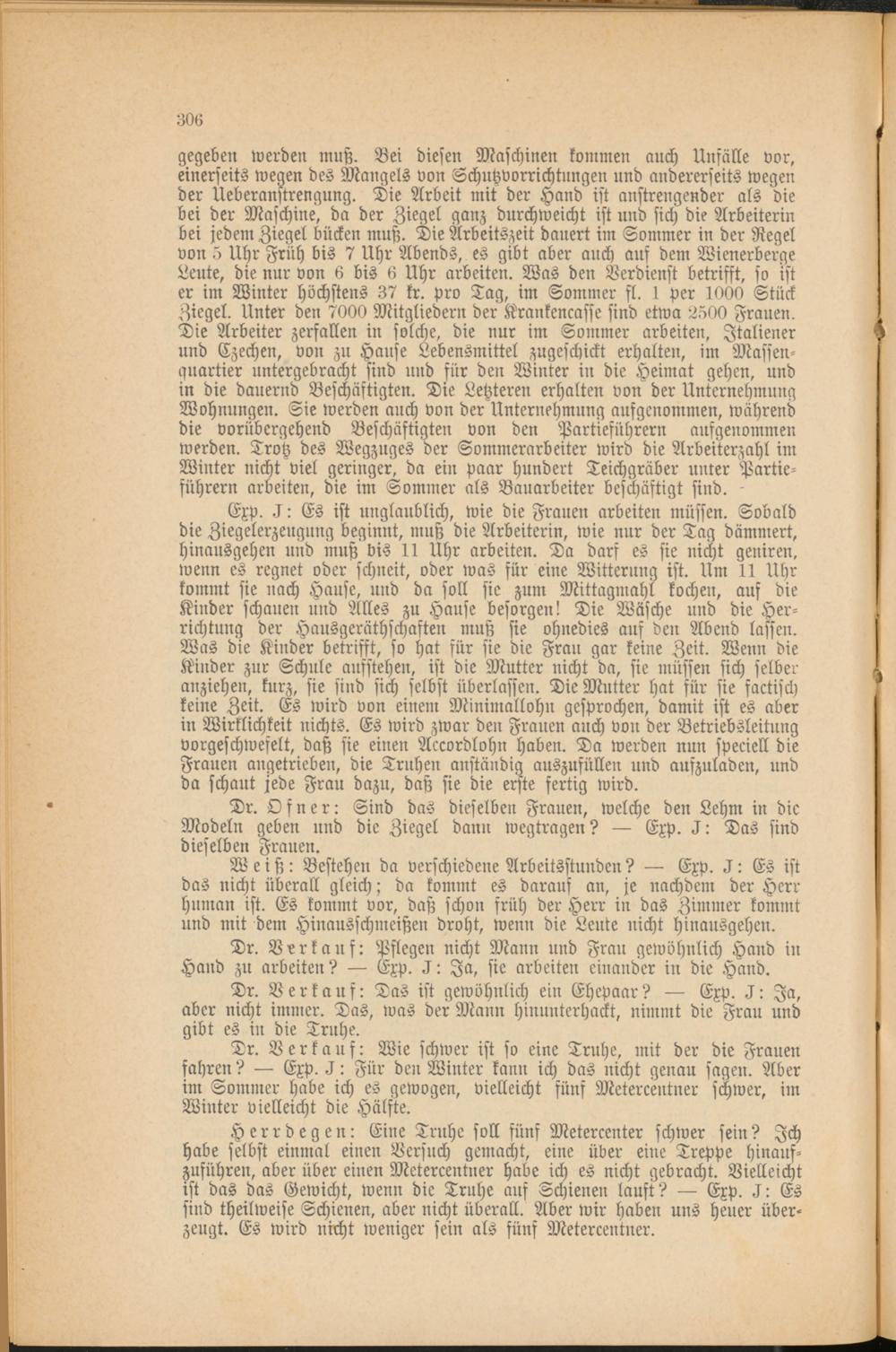 Exp. : Es ist unglaublich, wie die Frauen arbeiten müssen. Sobald die Ziegelerzengung beginnt, muß die Arbeiterin, wie nur der Tag dämmert, hinausgehen und muß bis 11 Uhr arbeiten. Da darf es sie nicht geuiren, wenn es regnet oder schneit, oder was für eine Witterung ist. Um 11 Uhr kommt sie nach Hause, und da soll sie zum Mittagmahl kochen, auf die Kinder schauen und Alles zu Hause besorgen! Die Wäsche und die Herrichtung der Hausgeräthschaften muß sie ohnedies auf den Abend lassen. Was die Kinder betrifft, so hat für sie die Frau gar keine Zeit. Wenn die Kinder zur Schule aufstehen, ist die Mutter nicht da, sie müssen sich selber anziehen, kurz, sie sind sich selbst überlassen. Die Mutter hat für sie factisch keine Zeit. Es wird von einem Minimallohn gesprochen, damit ist es aber in Wirklichkeit nichts. Es wird zwar den Frauen auch von der Betriebsleitung vorgeschwefelt, daß sie einen Accordlohn haben. Da werden nun speciell die Frauen angetrieben, die Truhen anständig auszufüllen und aufzuladen, und da schaut jede Frau dazu, daß sie die erste fertig wird.