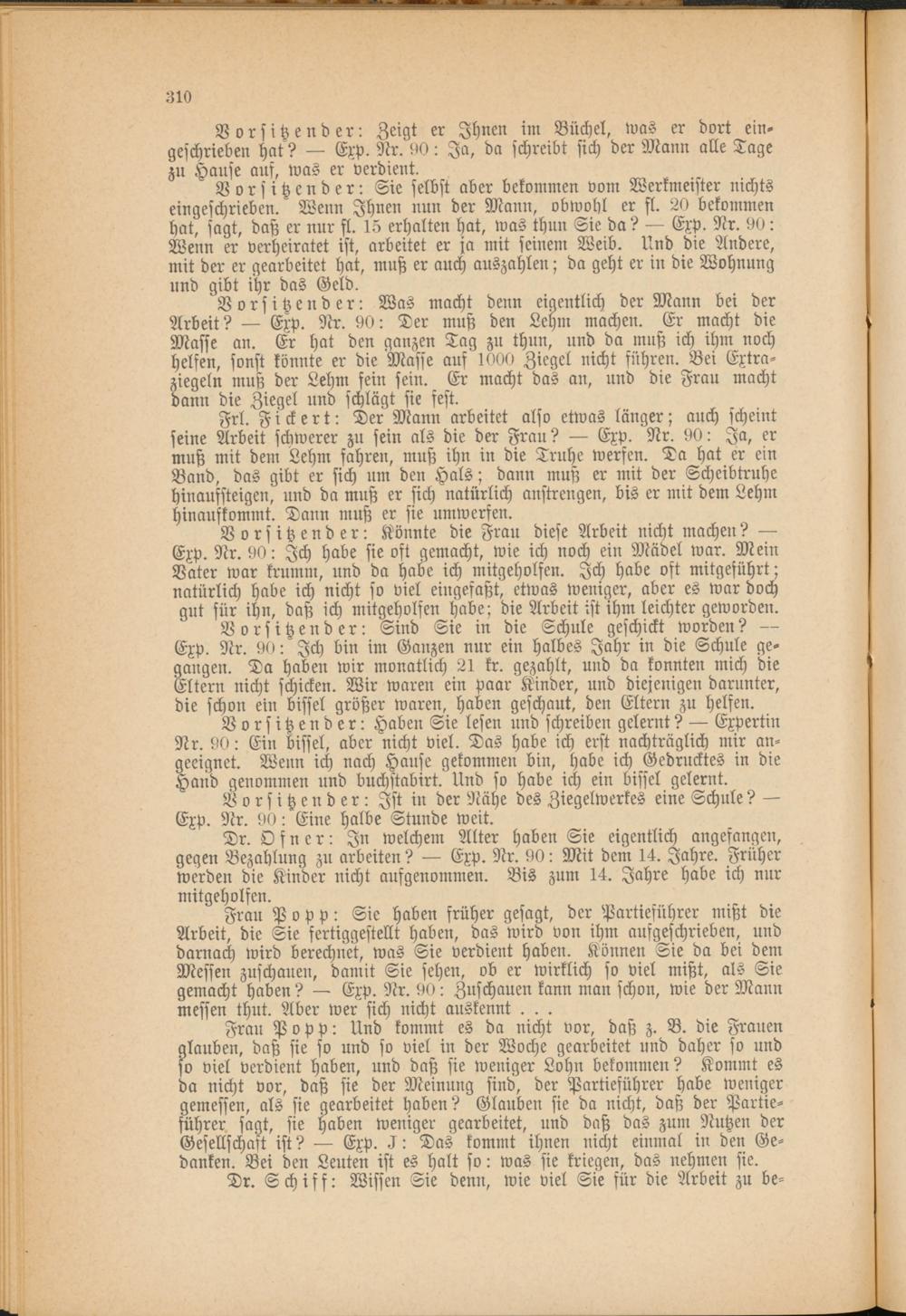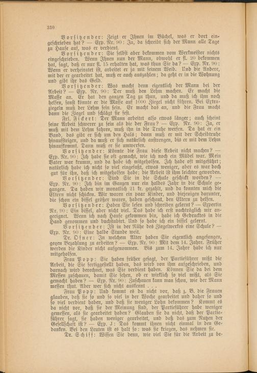 Dr. Ofner: In welchem Alter haben Sie eigentlich angefangen, gegen Bezahlung zu arbeiten? — Exp. Nr. 90: Mit dem 14. Jahre. Früher werden die Kinder nicht aufgenommen. Bis zum 14. Jahre habe ich nur mitgeholfen.