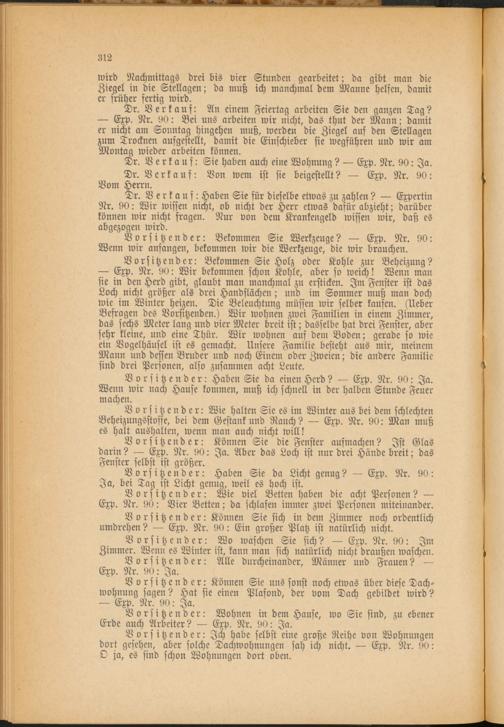 — Exp. Nr. 90: Wir bekommen schon Kohle, aber so weich! Wenn man sie in den Herd gibt, glaubt man manchmal zu ersticken. Im Fenster ist das Loch nicht größer als drei Handflächen; und im Sommer muß man doch wie im Winter heizen. Die Beleuchtung müssen wir selber kaufen. (Ueber Befragen des Vorsitzenden.) Wir wohnen zwei Familien in einem Zimmer, das sechs Meter lang und vier Meter breit ist; dasselbe hat drei Fenster, aber sehr kleine, und eine Thür. Wir wohnen auf dem Boden; gerade so wie ein Vogelhäusel ist es gemacht. Unsere Familie besteht aus mir, meinem Mann und dessen Bruder und noch Einem oder Zweien; die andere Familie sind drei Personen, also zusammen acht Leute.