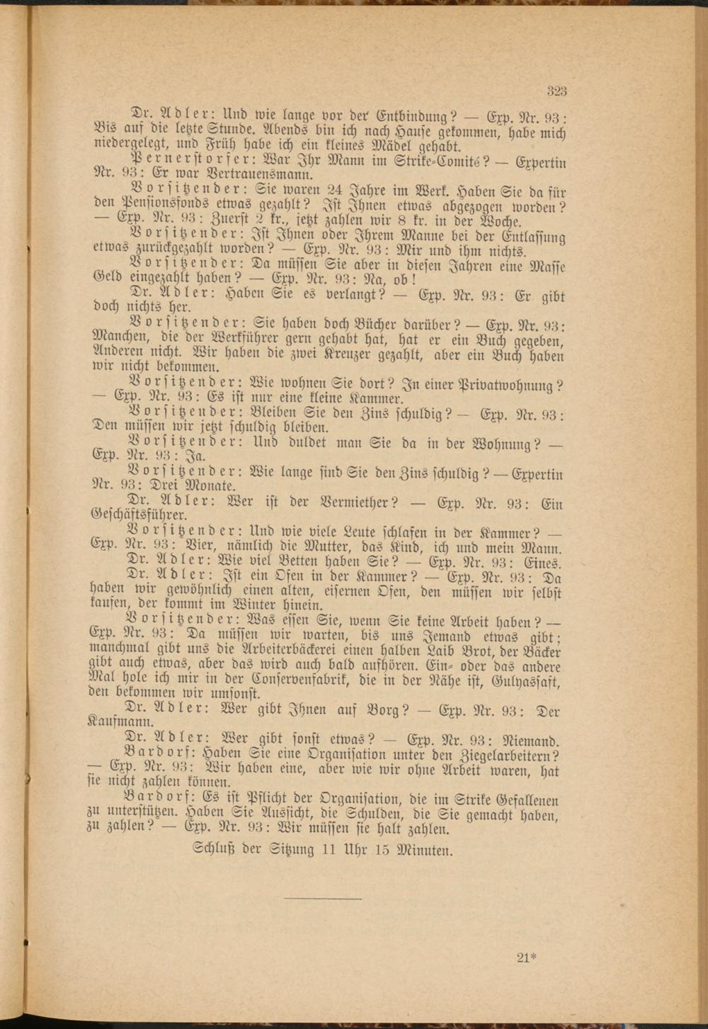 Dr. Adler: Und wie lange vor der Entbindung? Exp. Nr. 93: Bis auf die letzte Stunde. Abends bin ich nach Hause gekommen, habe mich niedergelegt, und Früh habe ich ein kleines Mädel gehabt.