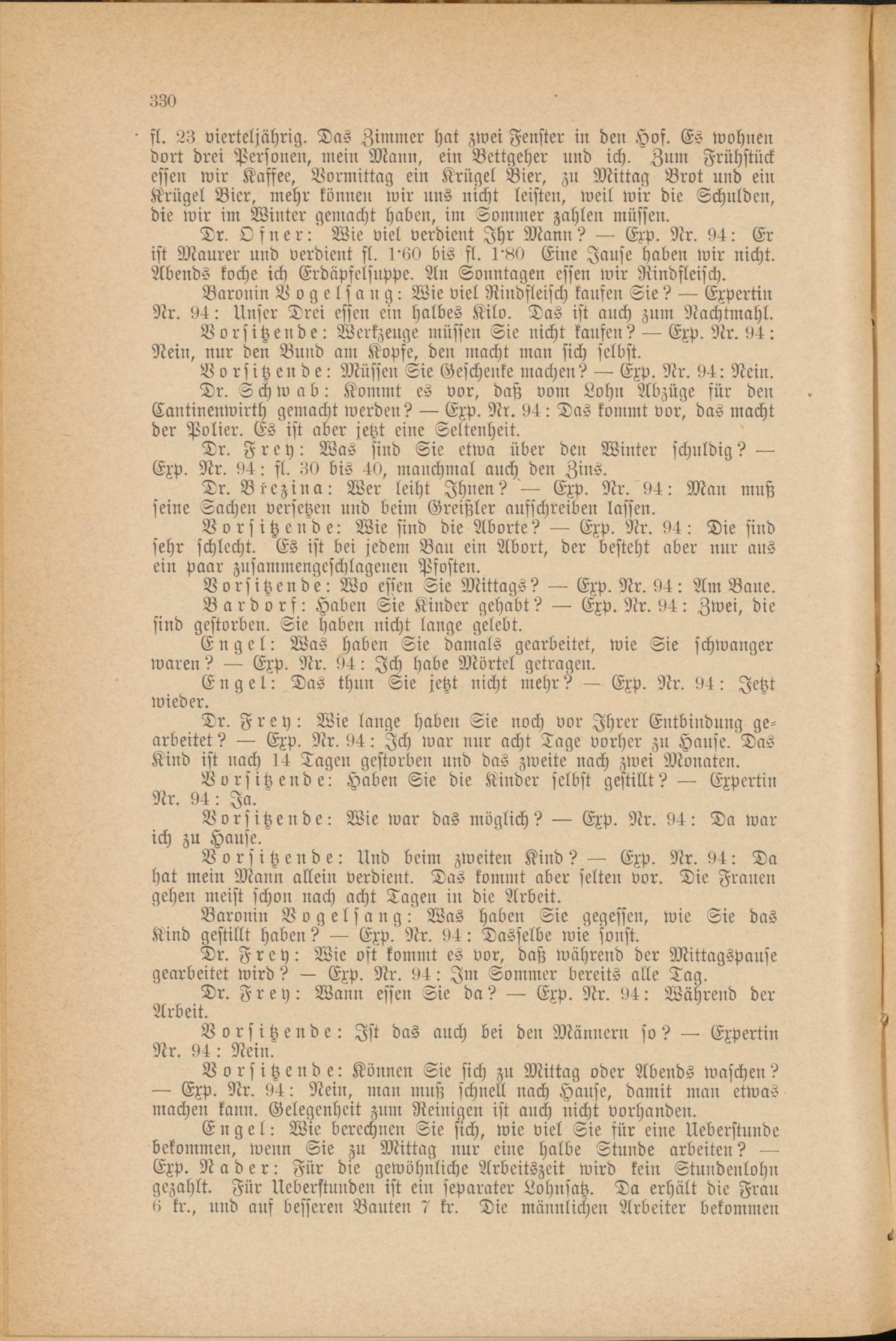 Dr. Osner: Wie viel verdient Ihr Mann? — Exp. Nr. 94: Er ist Maurer und verdient fl. 1B0 bis fl. 1'ttO Eine Jause haben wir nicht. Abends koche ich Erdäpfelsnppe. An Sonntagen essen wir Rindfleisch.