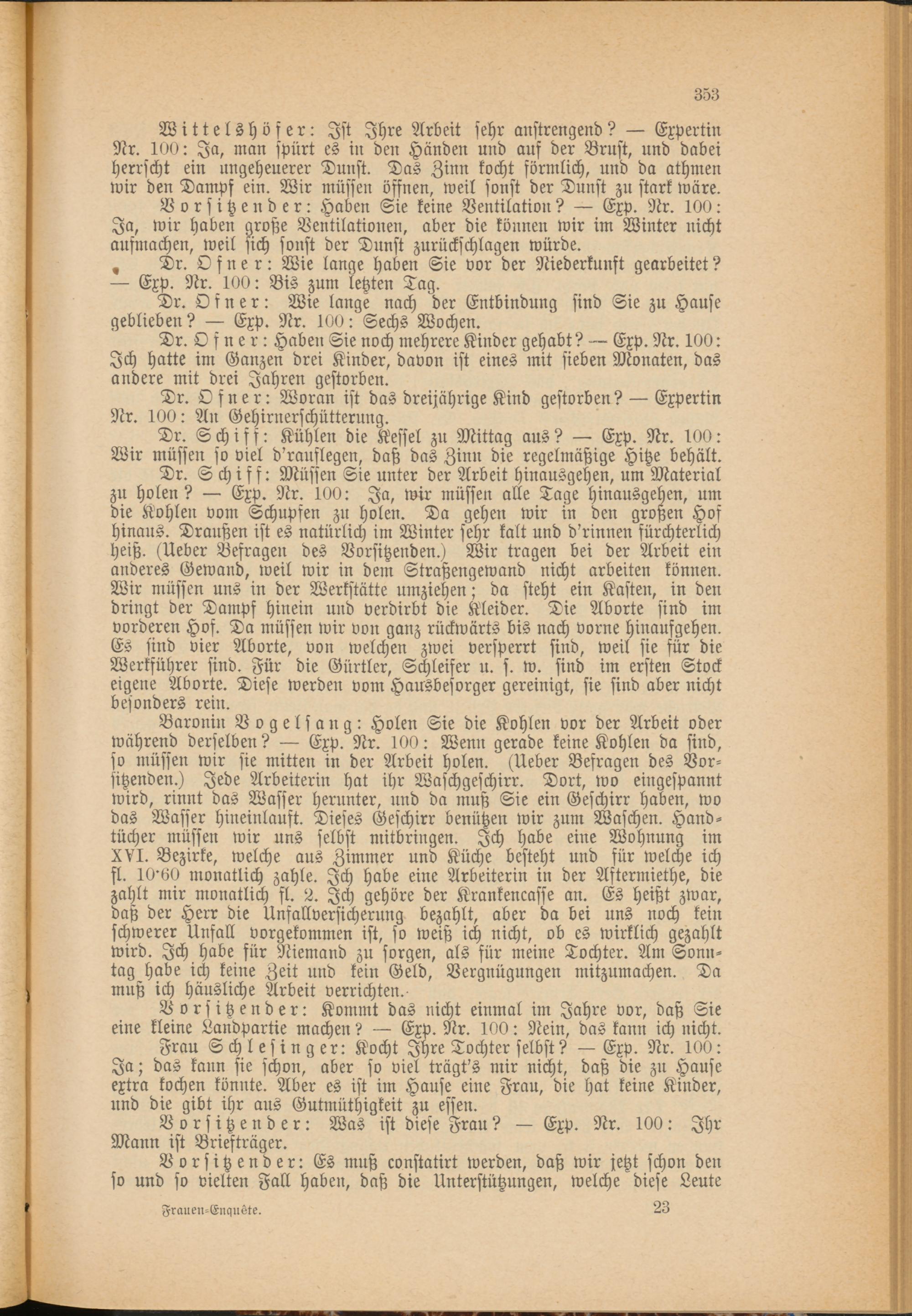 Baronin Vogelfang: Holen Sie die Kohlen vor der Arbeit oder während derselben? — Exp. Nr. 100: Wenn gerade keine Kohlen da sind, so müssen wir sie mitten in der Arbeit holen. (Ueber Befragen des Vorsitzenden.) Jede Arbeiterin hat ihr Waschgeschirr. Dort, wo eingespannt wird, rinnt das Wasser herunter, und da muß Sie ein Geschirr haben, wo das Wasser hineinlauft. Dieses Geschirr benützen wir zum Waschen. Handtücher müssen wir uns selbst mitbringen. Ich habe eine Wohnung im XVI. Bezirke, welche aus Zimmer und Küche besteht und für welche ich st. 10'60 monatlich zahle. Ich habe eine Arbeiterin in der Aftermiethe, die zahlt mir monatlich st. 2. Ich gehöre der Krankencasse an. Es heißt zwar, daß der Herr die Unfallversicherung bezahlt, aber da bei uns noch kein schwerer Unfall vorgekommen ist, so weiß ich nicht, ob es wirklich gezahlt wird. Ich habe für Niemand zu sorgen, als für meine Tochter. Am Sonntag habe ich keine Zeit und kein Geld, Vergnügungen mitzumachen. Da muß ich häusliche Arbeit verrichten.