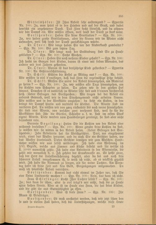 Frau Schlesinger: Kocht Ihre Tochter selbst? — Exp. Nr. 100: Ja; das kann sie schon, aber so viel trägt's mir nicht, daß die zu Hause extra kochen könnte. Aber es ist im Hause eine Frau, die hat keine Kinder, und die gibt ihr aus Gutmütigkeit zu essen.