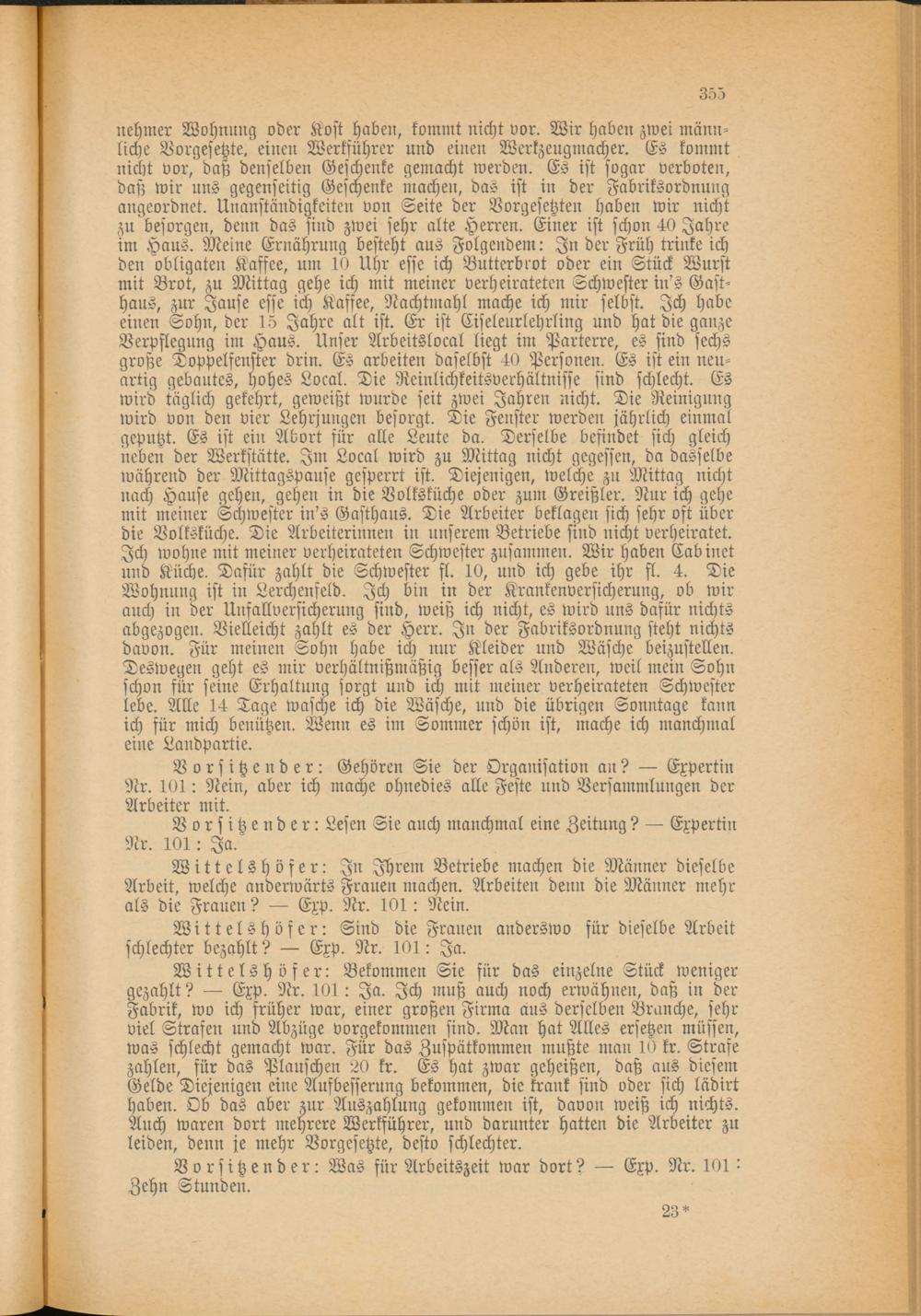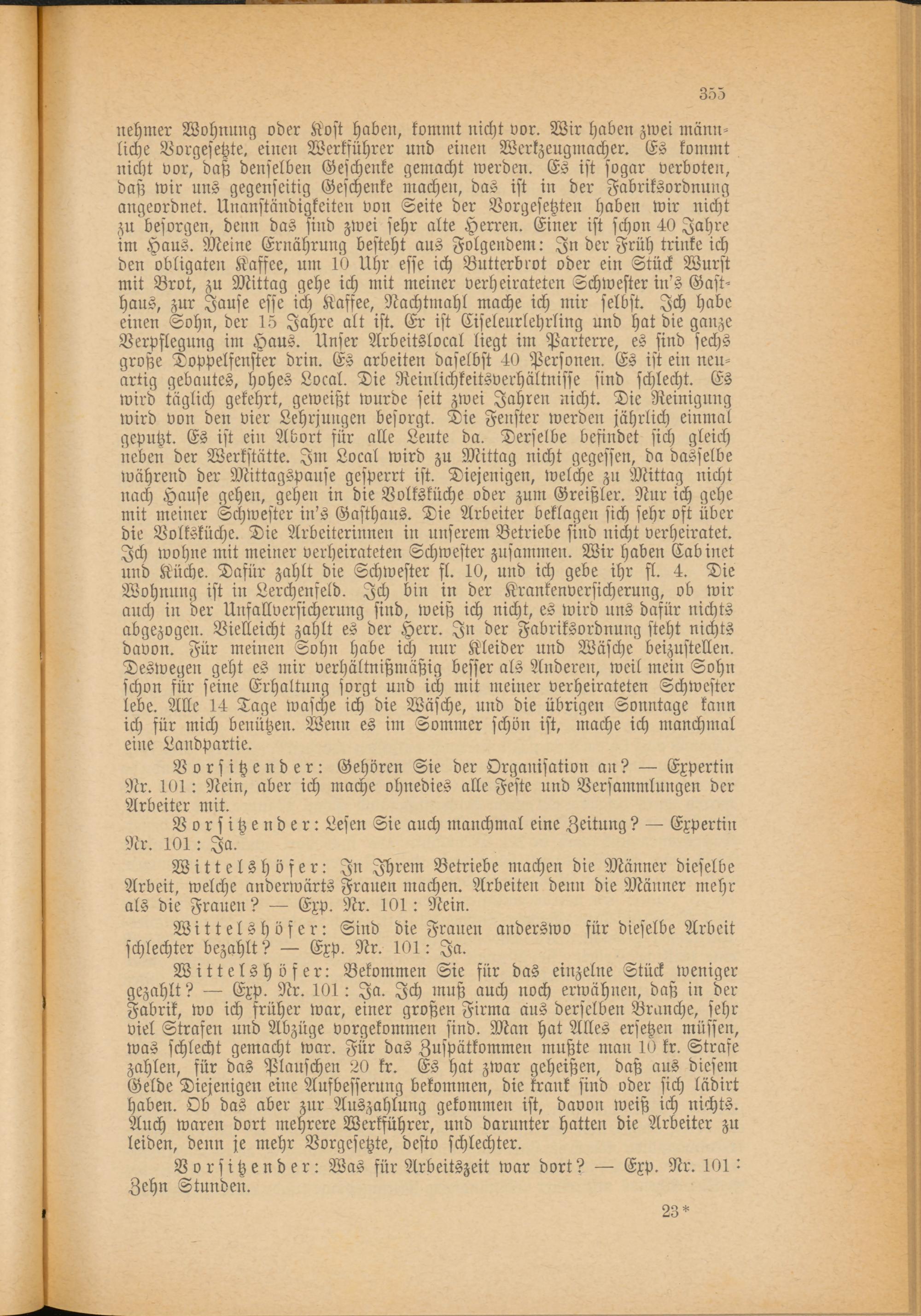 Wittelshöser: In Ihrem Betriebe machen die Männer dieselbe Arbeit, welche anderwärts Frauen machen. Arbeiten denn die Männer mehr als die Frauen? — Exp. Nr. 101: Nein.