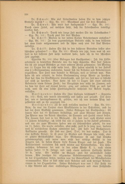 Dr. Schwab: Wie viel Ueberstunden haben Sie in dem jetzigen Betriebe täglich? — Exp. Nr. 101: Manchmal zwei bis drei Stunden.