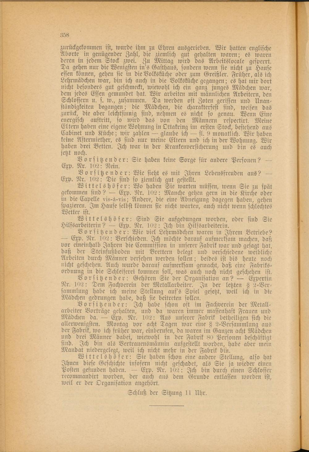 Vorsitzender: Wie viel Lehrmädchen waren in Ihrem Betriebe? Exp. Nr. 102: Verschieden. Ich möchte darauf aufmerksam machen, daß vor eineinhalb Jahren die Commission in unserer Fabrik war und gesagt hat, daß der Steinfngboden mit Brettern belegt und verschiedene weibliche Arbeiten durch Männer versehen werden sollen; beides ist bis heute noch nicht geschehen. Auch wurde daraus aufmerksam gemacht, daß eine Fabriks­ordnung in die Schleiferei kommen soll, was auch noch nicht geschehen ist.