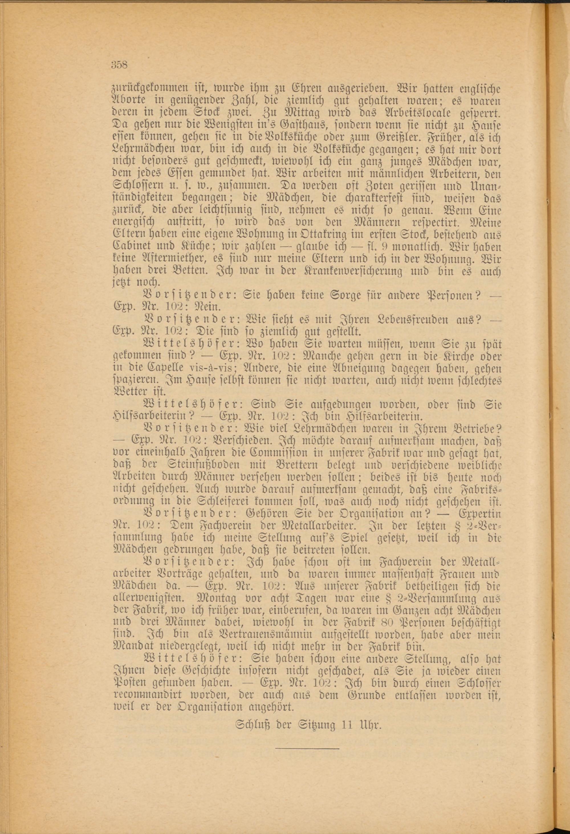 Wittelshöfer: Sie haben schon eine andere Stellung, also hat Ihnen diese Geschichte insofern nicht geschadet, als Sie ja wieder einen Posten gesunden haben. Exp. Nr. 102: Ich bin durch einen Schlosser recommandirt worden, der auch aus dem Grunde entlassen worden ist, weil er der Organisation angehört.
