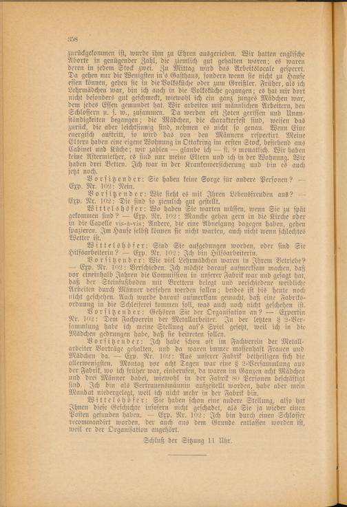 Vorsitzender: Ich habe schon oft in: Fachverein der Metall­arbeiter Vortrüge gehalten, und da waren immer massenhaft Frauen und Mädchen da. Exp. Nr. 102: Aus unserer Fabrik betheiligen sich die allerwenigsten. Montag vor acht Tagen war eine ß 2-Versammlung aus der Fabrik, wo ich früher war, einberufen, da waren in: Ganzen acht Mädchen und drei Männer dabei, wiewohl in der Fabrik 80 Personen beschäftigt sind. Ich bin als Vertrauensmännin aufgestellt worden, habe aber mein Mandat niedergelegt, weil ich nicht mehr in der Fabrik bin.
